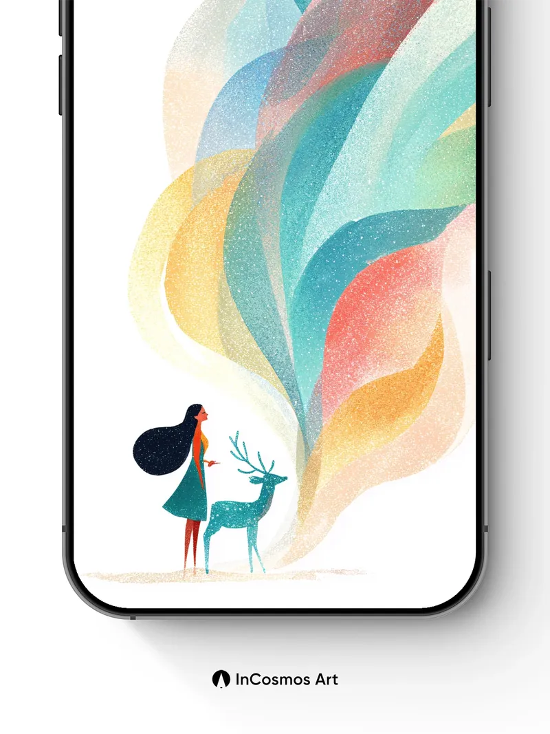 Did you know that certain pigments reflect light like cosmic dust, creating a shimmer that feels alive? Here, swirling gradients breathe across the canvas like wind through stained glass, each hue pulsing with quiet energy. A lone figure and a stag stand beneath this luminous cascade, dwarfed by the vastness of color that seems to flow from another dimension—soft yet commanding, still yet in motion.