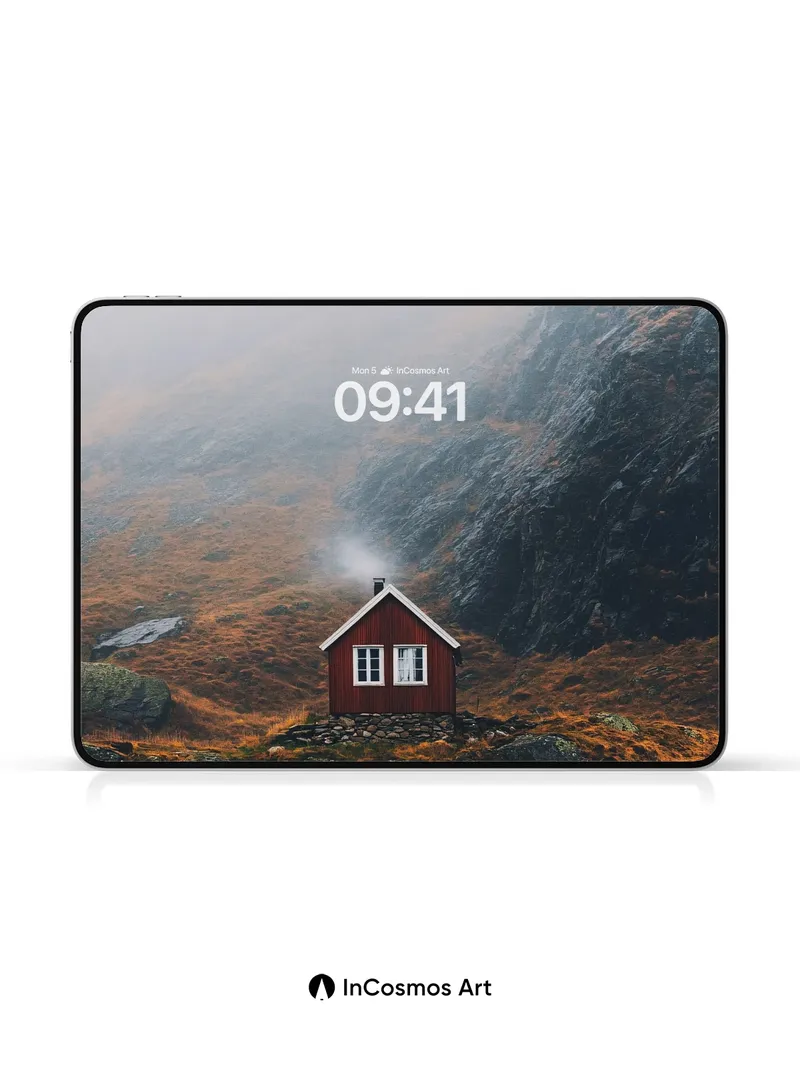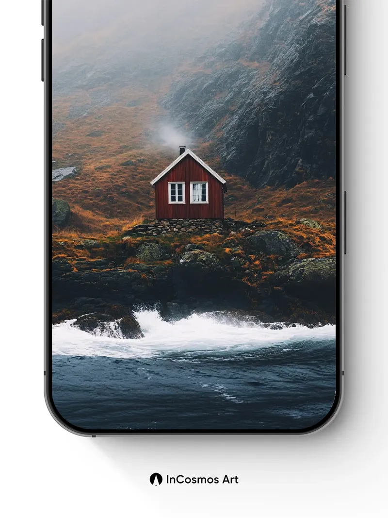 Debug product.metafields.custom.desc: Did you know that the color of moss in northern fjords shifts from emerald to rust as autumn breathes across the stone? A solitary red cabin sits perched on jagged rock, its chimney exhaling a ghostly plume into the fog-laden air, where light crawls over wet granite like memory. The sea crashes below in white foam, echoing centuries of solitude, while the mountain looms—silent, ancient, watching.
