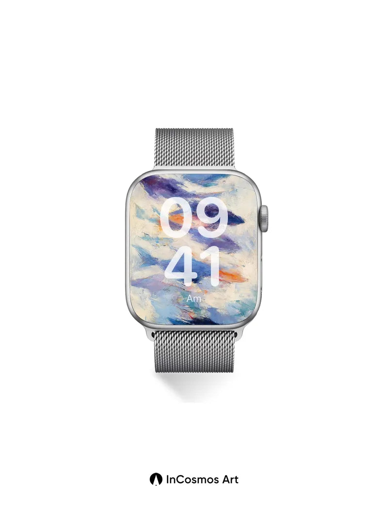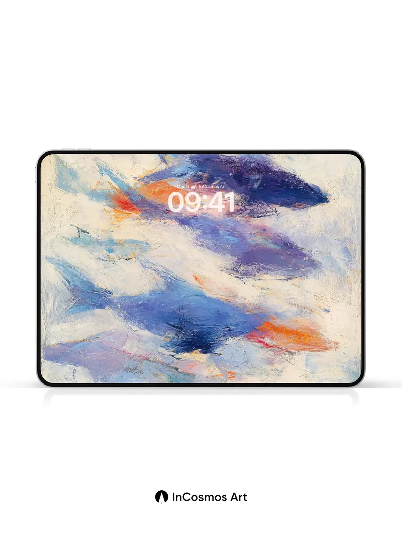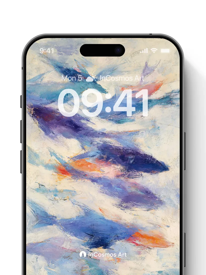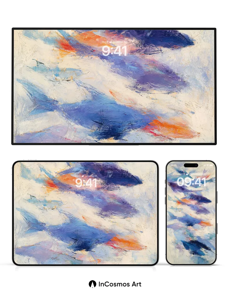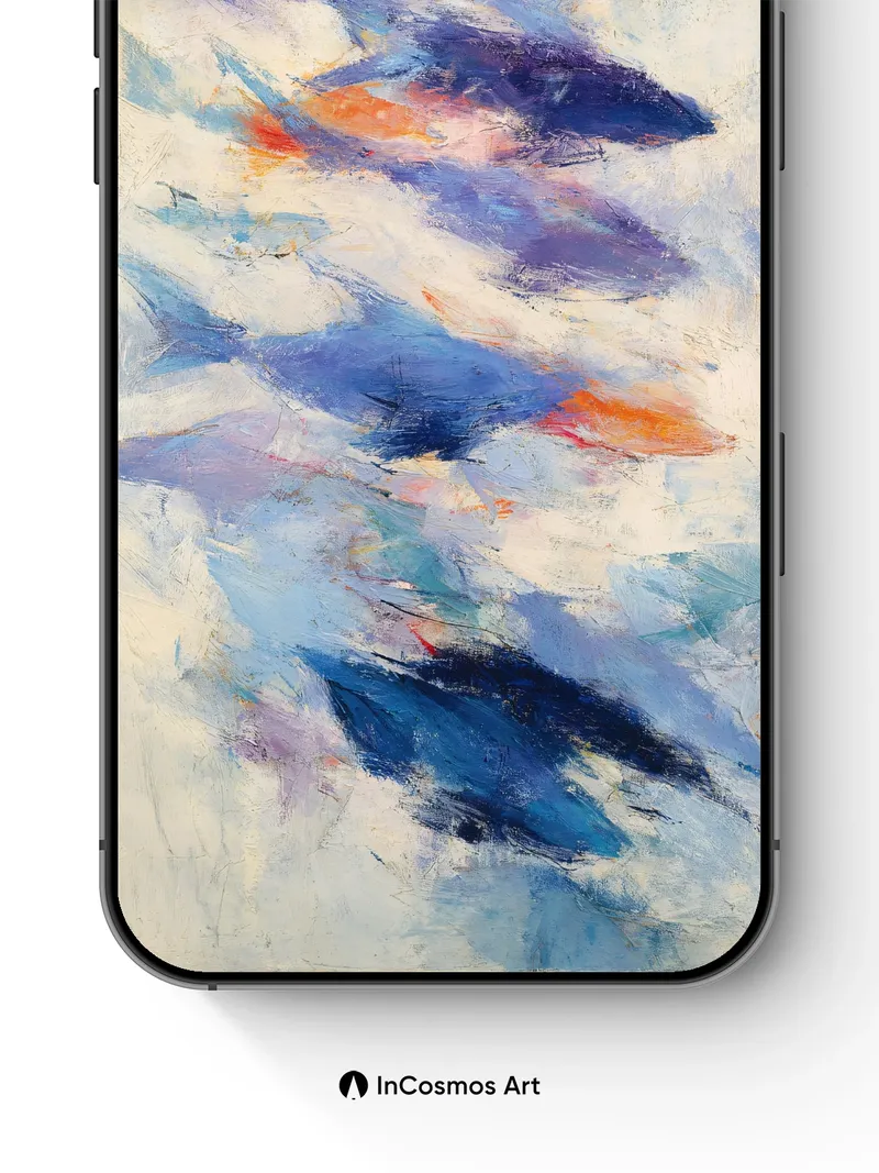 Did you know that ocean currents can carry colors like ink through water, creating invisible maps beneath the surface? Here, strokes of cobalt and indigo drift like tides across a canvas of misty cream, each brushstroke a secret trail left by unseen winds. You feel the coolness of deep waters on your skin as light slips between layers, revealing moments where warmth flares in coral glimmers—like sunken lanterns pulsing under waves.