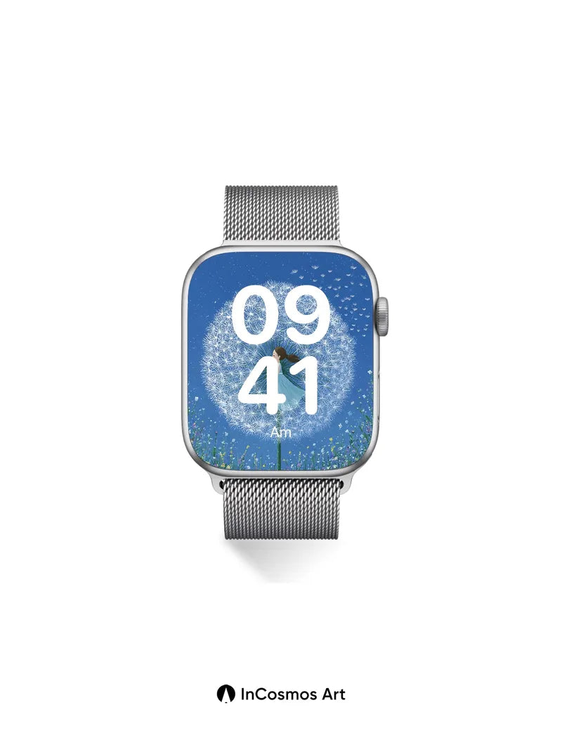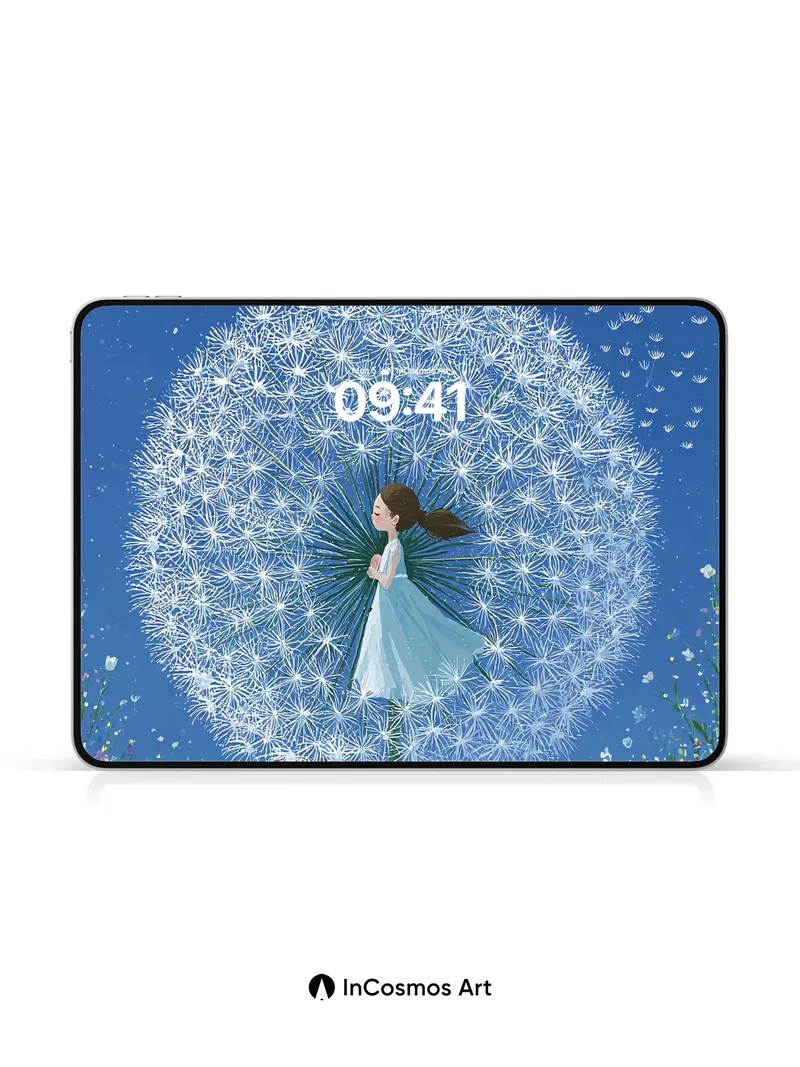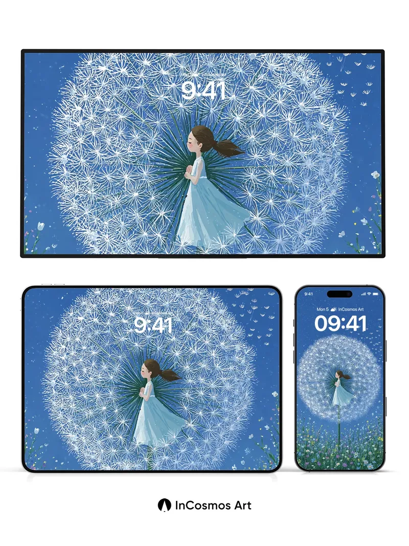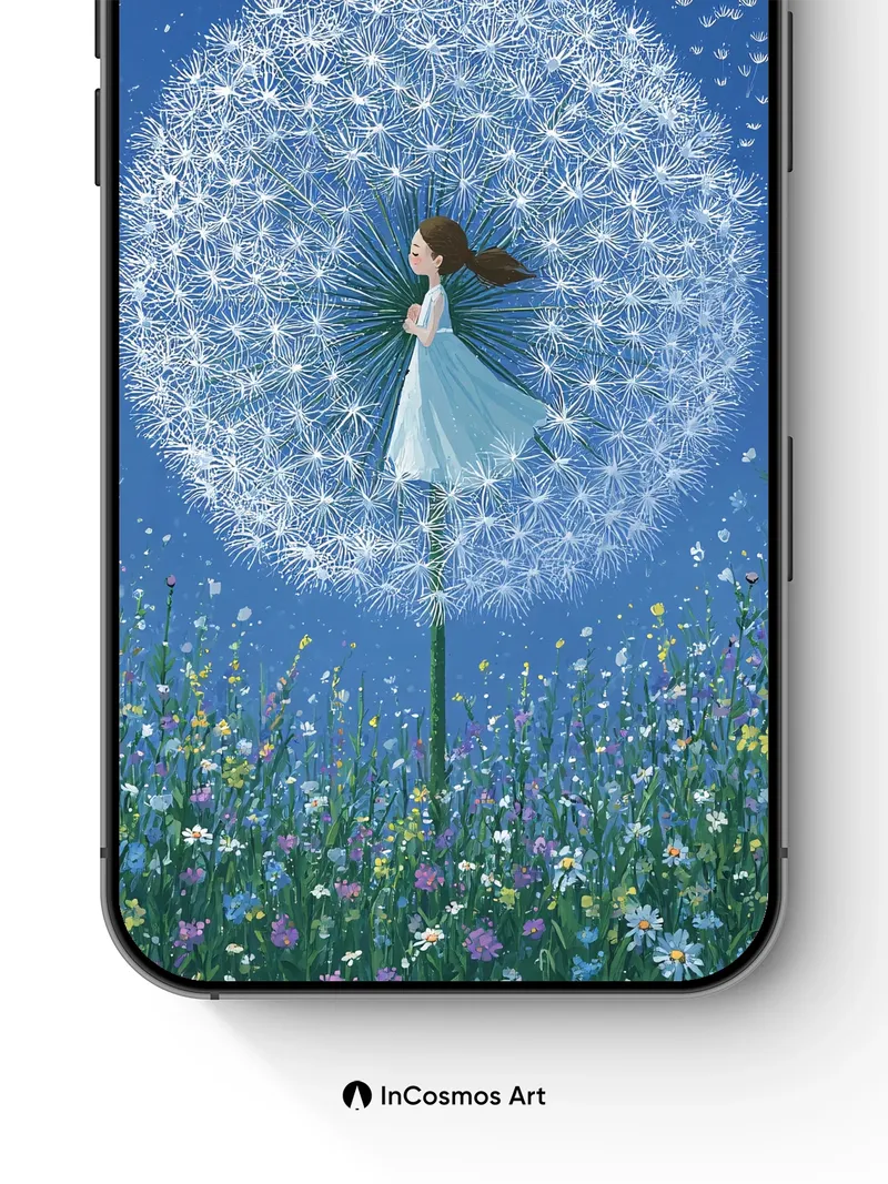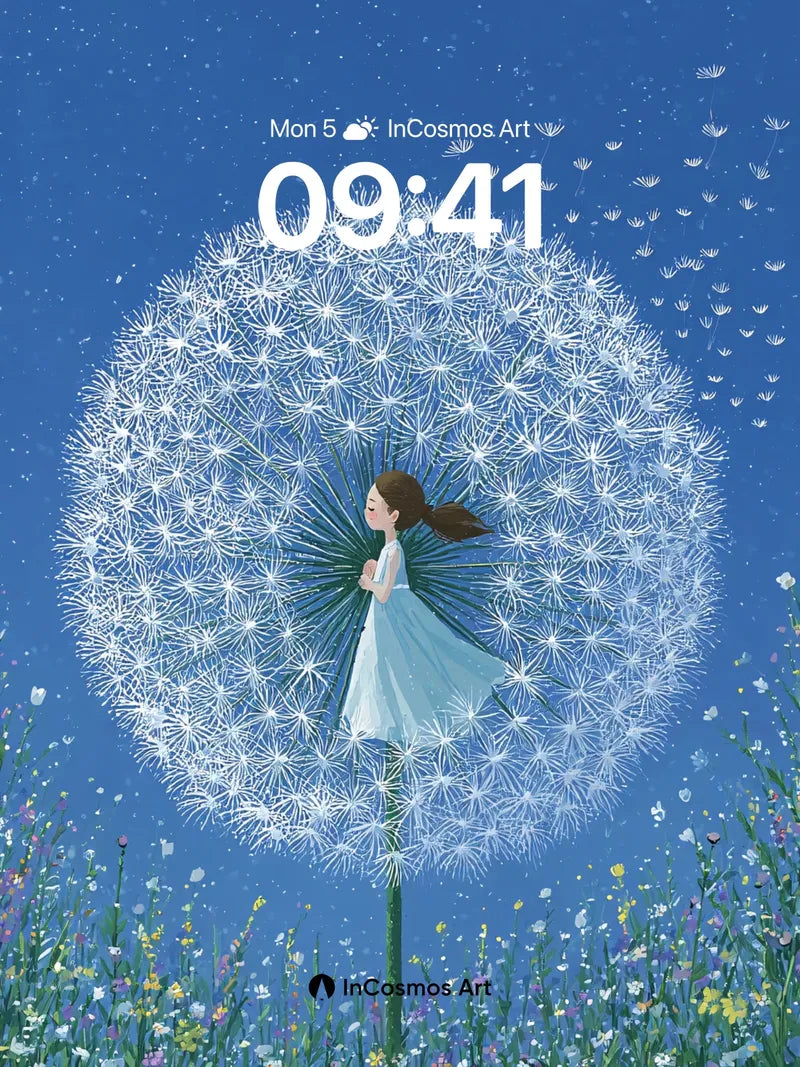 Debug product.metafields.custom.desc: Did you know dandelion seeds can travel over 100 feet on a single breeze, each one a tiny wish carried by the wind? In this scene, a girl in a flowing gown stands at the heart of a colossal dandelion clock, its delicate fluff glowing like frozen stardust against a deep midnight blue sky. The meadow below hums with wildflowers—daisies, cornflowers, and buttercups—each petal catching the soft light as if breathing slowly. Above, scattered seed parachutes drift upward like silent prayers into the infinite dark.