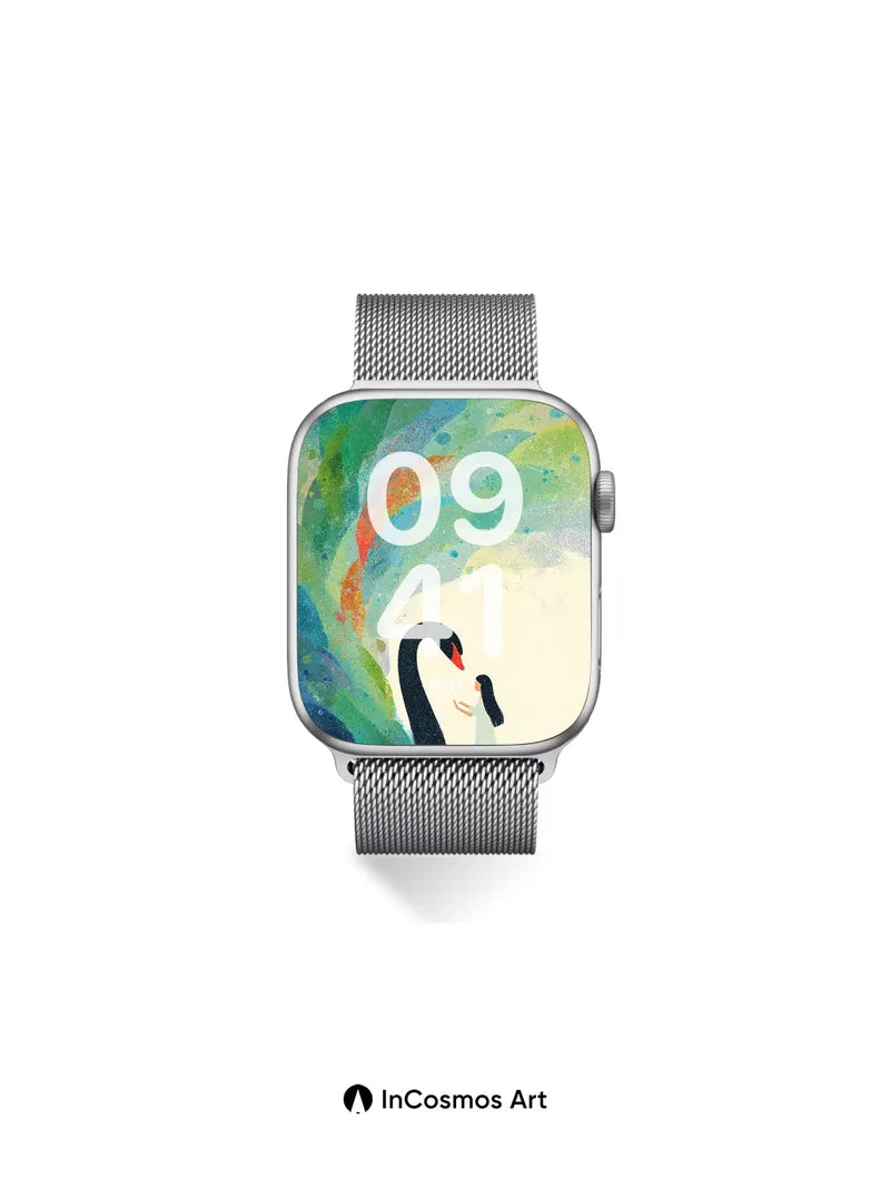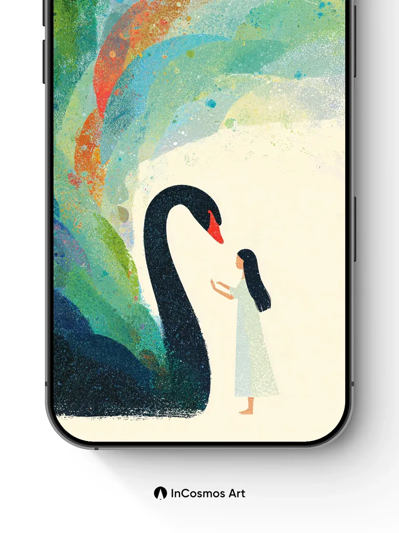 Debug page_description: Did you know the iridescent hues in this artwork mimic the way light dances across deep ocean trenches? A girl stands barefoot at the edge of a luminous void, her hand gently touching the curve of a black swan’s neck, its red beak glowing like a secret flame. The background breathes in waves of emerald and sapphire, swirling like living ink beneath a sky that remembers dreams. Share this with your best friend. Send this to your love and swap a matching set. What if every glance held a world waiting to unfold?