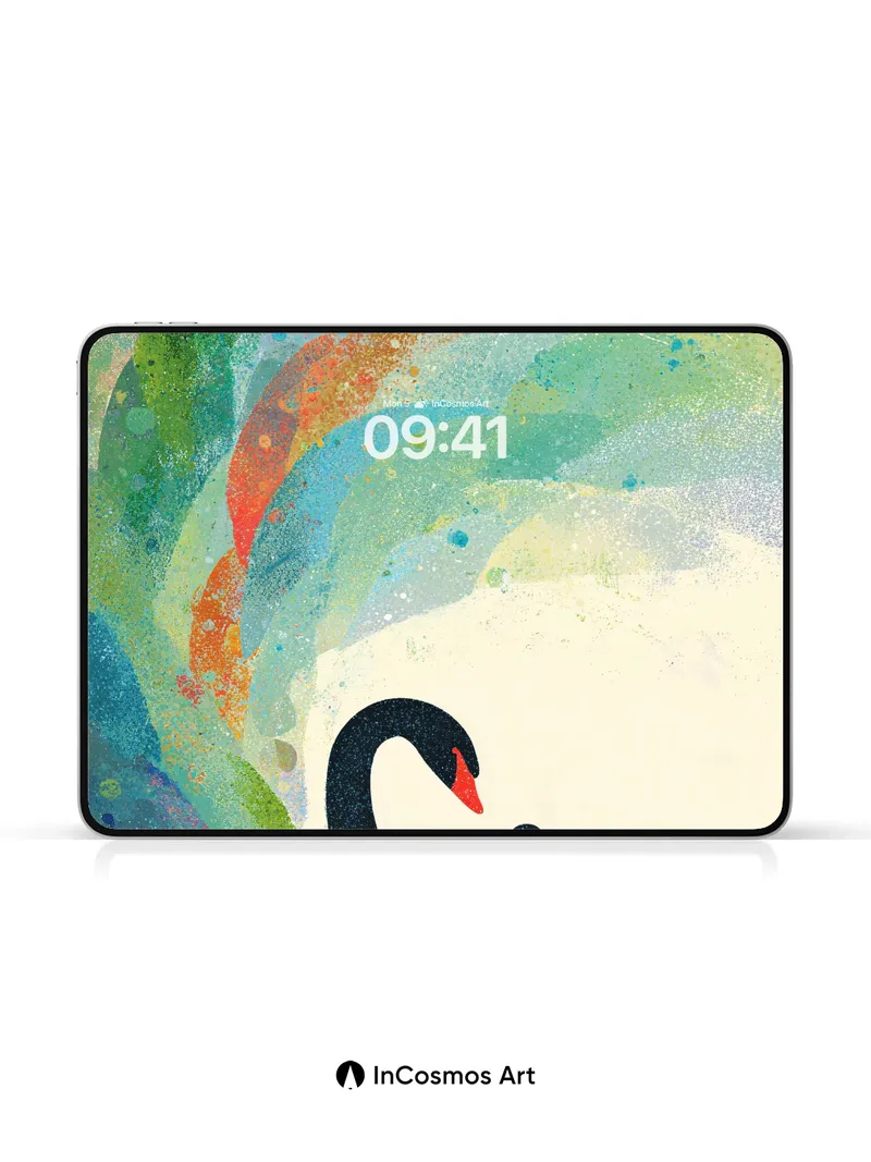 Debug product.metafields.custom.desc: Did you know the iridescent hues in this artwork mimic the way light dances across deep ocean trenches? A girl stands barefoot at the edge of a luminous void, her hand gently touching the curve of a black swan’s neck, its red beak glowing like a secret flame. The background breathes in waves of emerald and sapphire, swirling like living ink beneath a sky that remembers dreams.