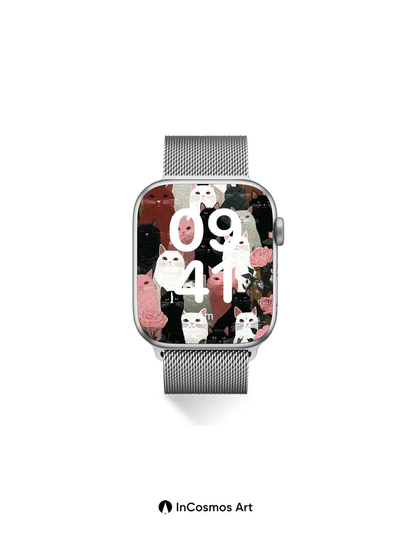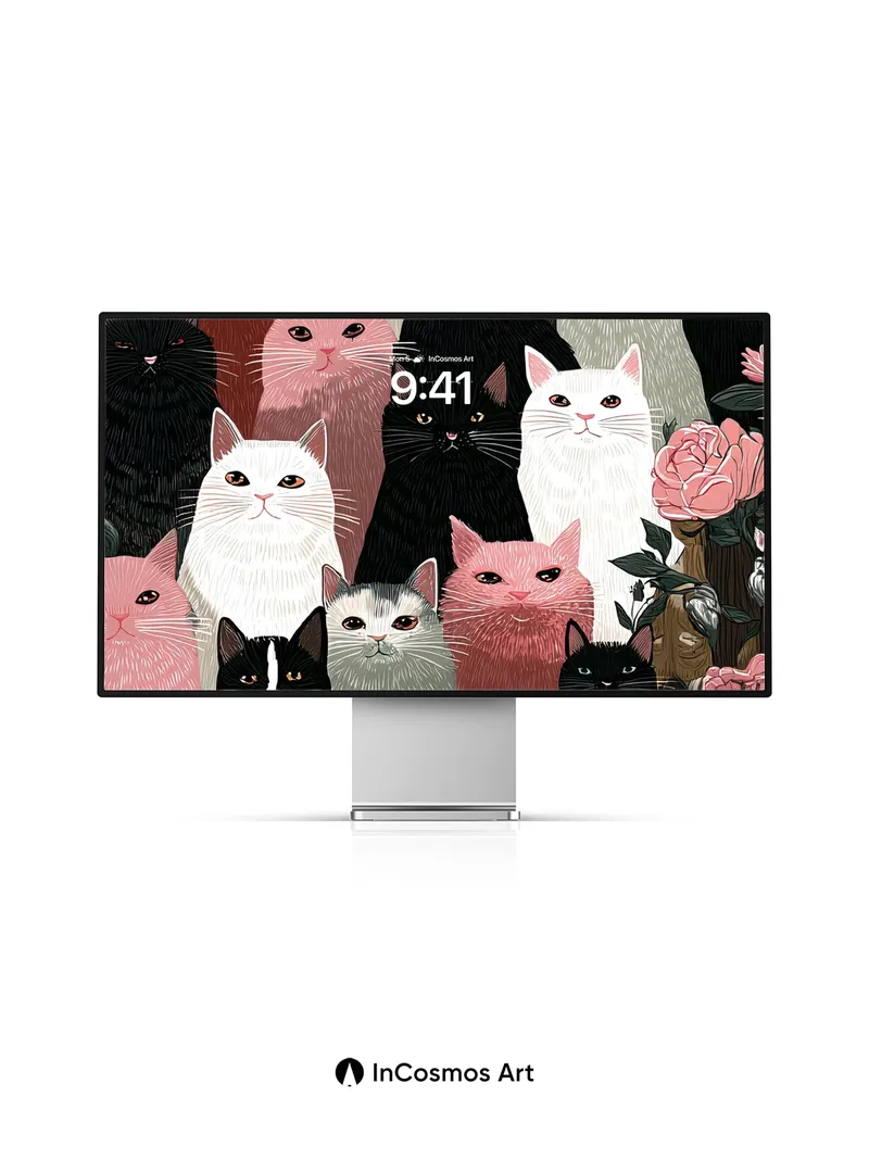 Debug product.metafields.custom.desc: Did you know cats have been depicted in art for over 5,000 years, often as guardians of the unseen? Here, they emerge from a thicket of blush roses and shadowed leaves, their eyes like polished obsidian or moonlit pearls—each gaze a silent story. The texture of fur breathes across the canvas, soft as spun silk, while petals unfurl with quiet insistence, framing feline faces in floral halos.