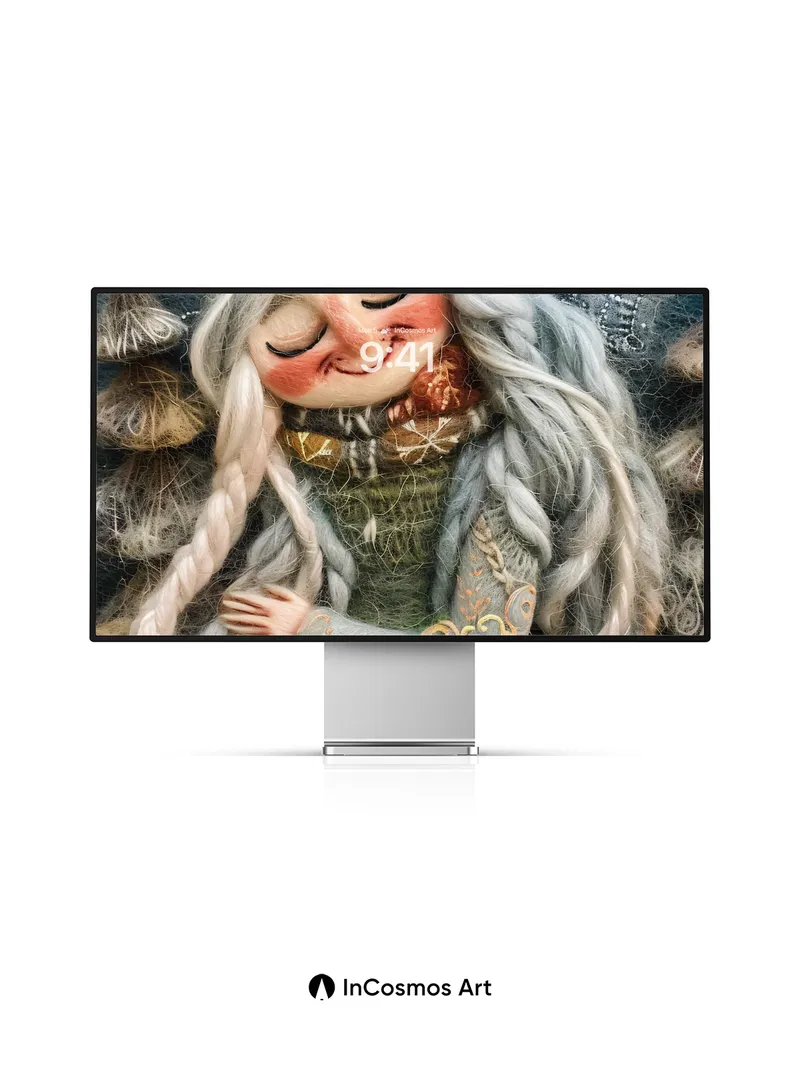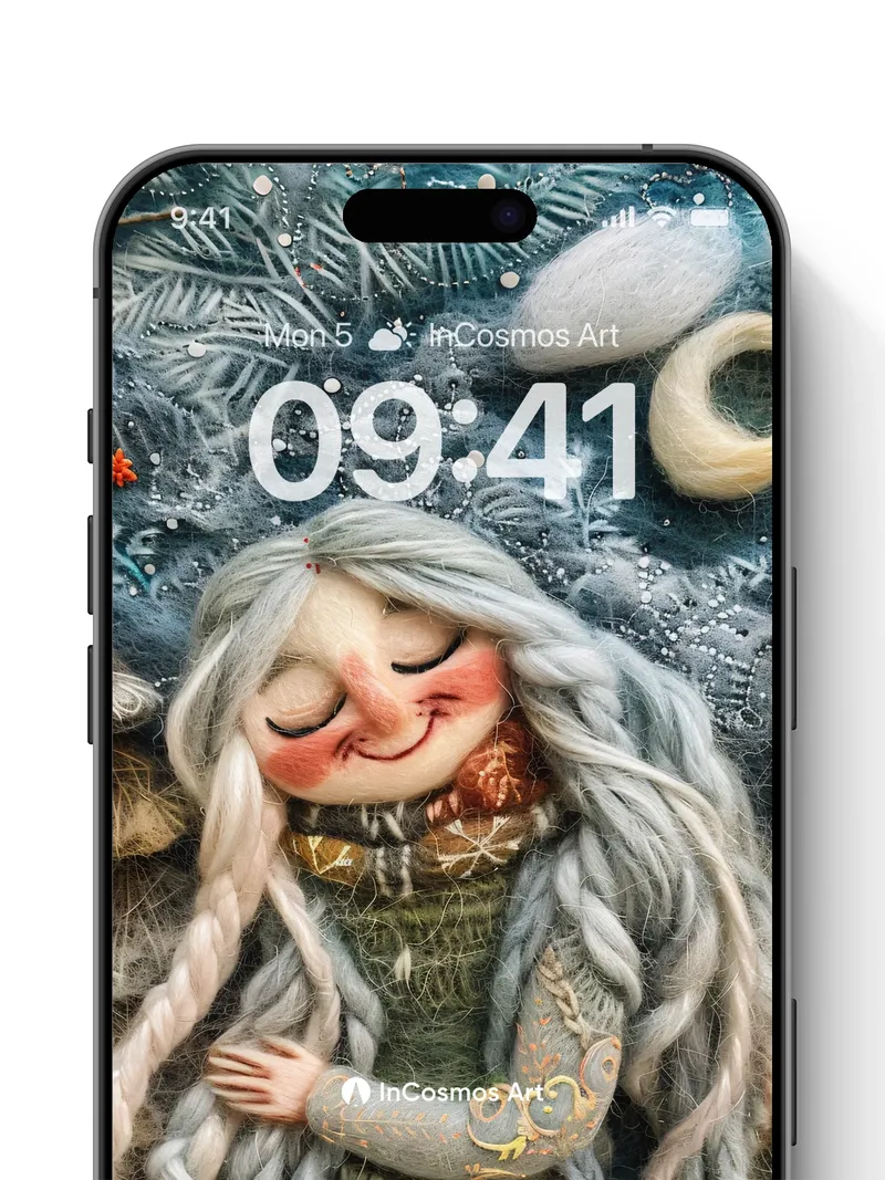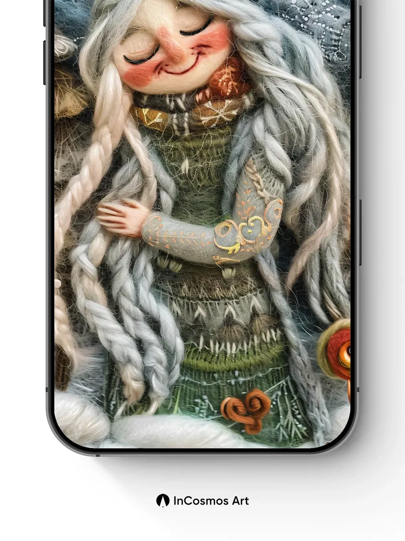 Debug product.metafields.custom.desc: Did you know that ancient Nordic artisans wove wool into tapestries to trap warmth and stories? Here, silver hair braids like frozen rivers through a forest of felted pine and moonlight fluff, each thread breathing soft frost. You’ll feel the quiet hum of snowfall in your fingertips as the doll’s closed eyes cradle a secret smile beneath a sky stitched with stars and crescent moons.