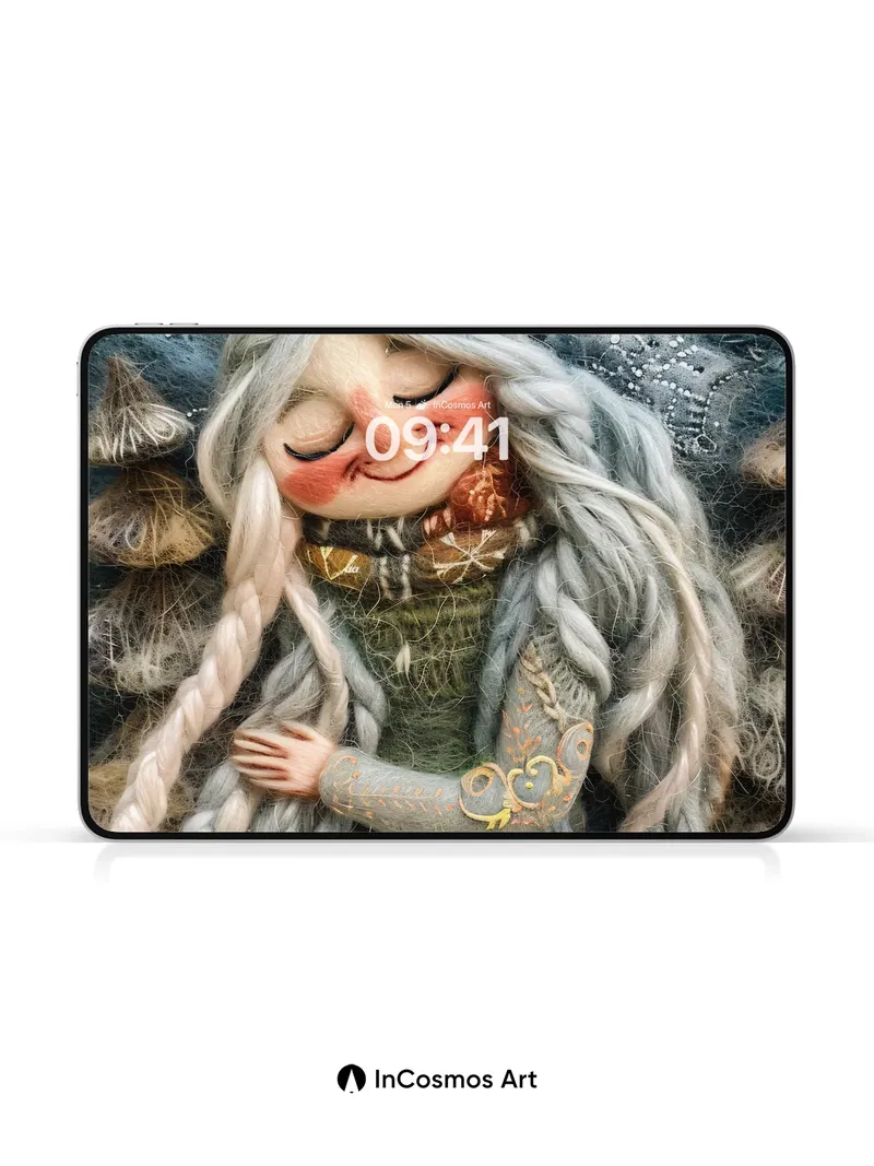 Did you know that ancient Nordic artisans wove wool into tapestries to trap warmth and stories? Here, silver hair braids like frozen rivers through a forest of felted pine and moonlight fluff, each thread breathing soft frost. You’ll feel the quiet hum of snowfall in your fingertips as the doll’s closed eyes cradle a secret smile beneath a sky stitched with stars and crescent moons.