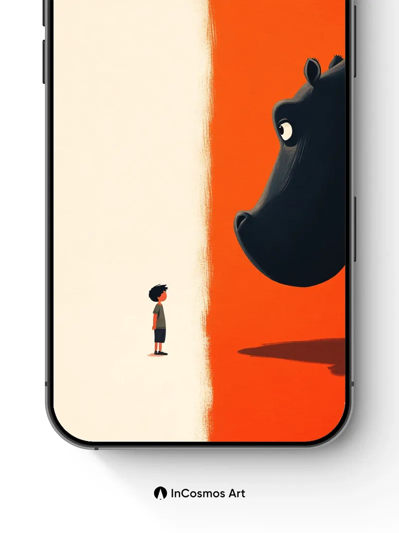 Debug page_description: Did you know that hippos can hold their breath underwater for up to five minutes? In this moment, a child stands at the edge of an infinite beige void, facing a colossal hippo whose shadow stretches like a silent promise across the burnt-orange wall. The contrast between the vastness and the small figure creates a tension that hums just below the surface—like a story waiting to be told. Share this with your best friend. Send this to your love and swap a matching set. What if every shadow held a memory only you could see?