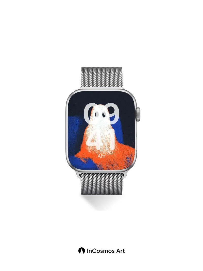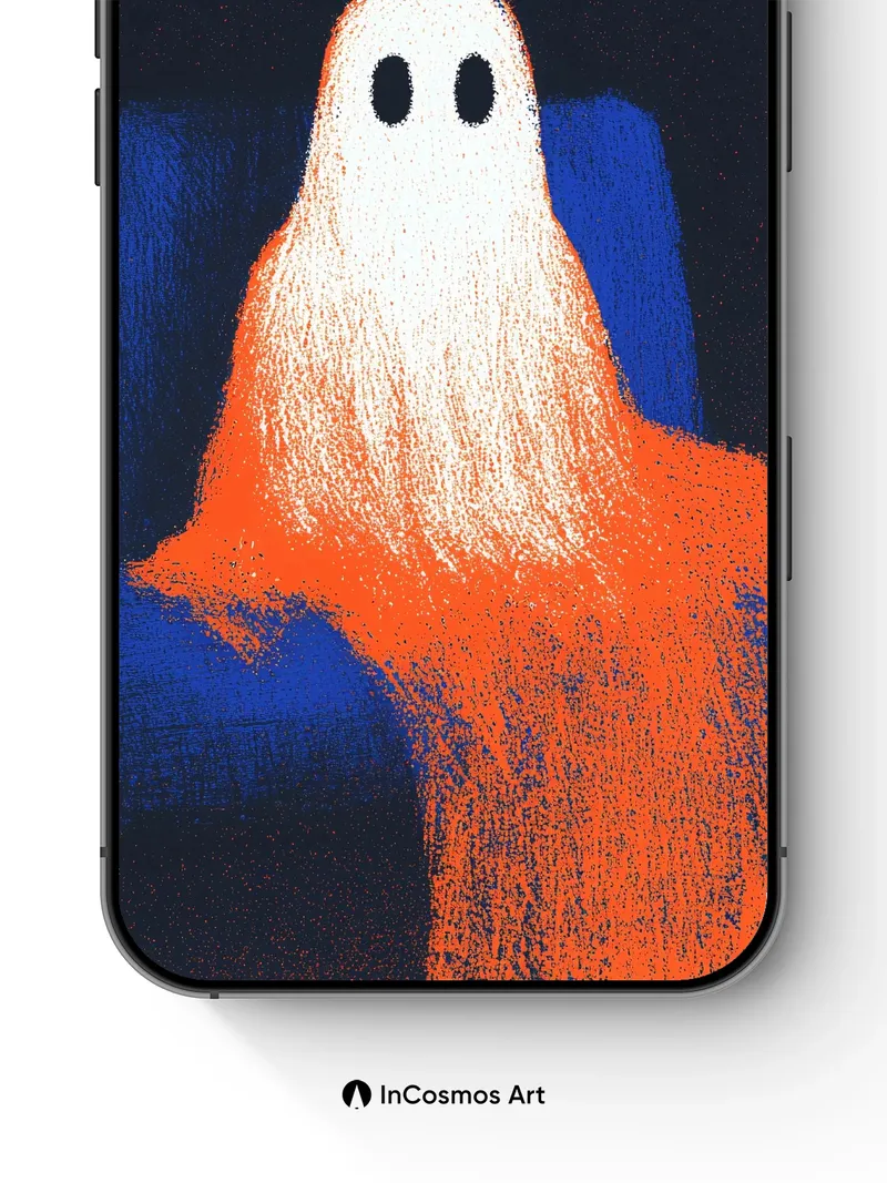 Debug og_description: Did you know ghostly figures in folklore were once believed to be made of condensed breath? This spectral form glows with a texture like chalk dust stirred in moonlight, its white shape softly bleeding into a fiery orange blanket that drapes over deep blue fabric as if warmth is seeping from another realm. You feel the chill of the dark behind it, yet the color hums with quiet life.