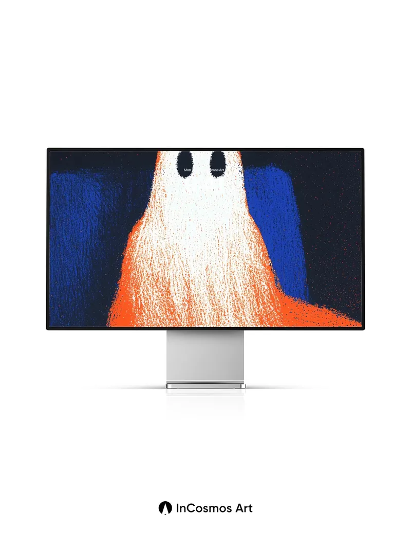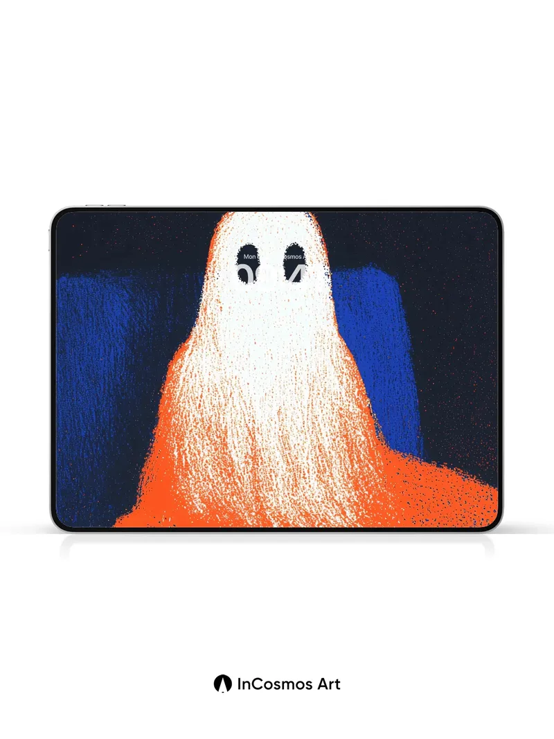 Debug product.metafields.custom.desc: Did you know ghostly figures in folklore were once believed to be made of condensed breath? This spectral form glows with a texture like chalk dust stirred in moonlight, its white shape softly bleeding into a fiery orange blanket that drapes over deep blue fabric as if warmth is seeping from another realm. You feel the chill of the dark behind it, yet the color hums with quiet life.