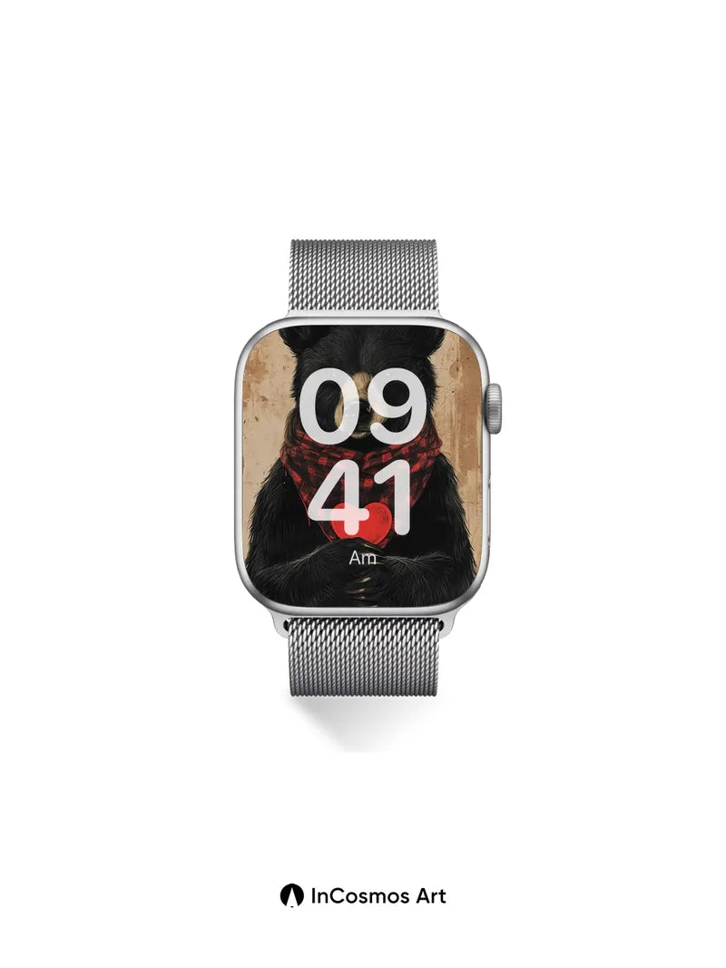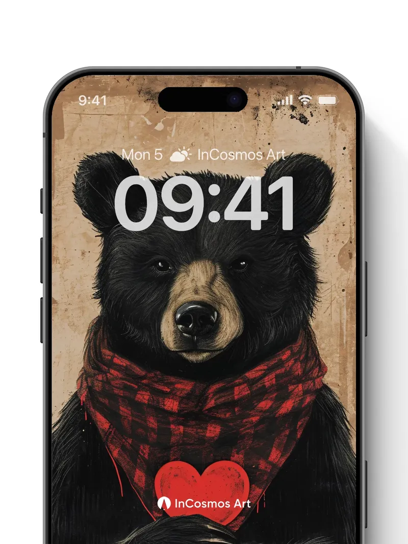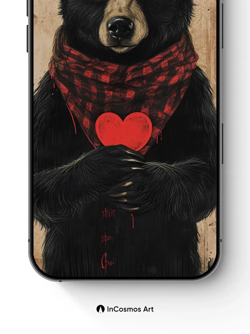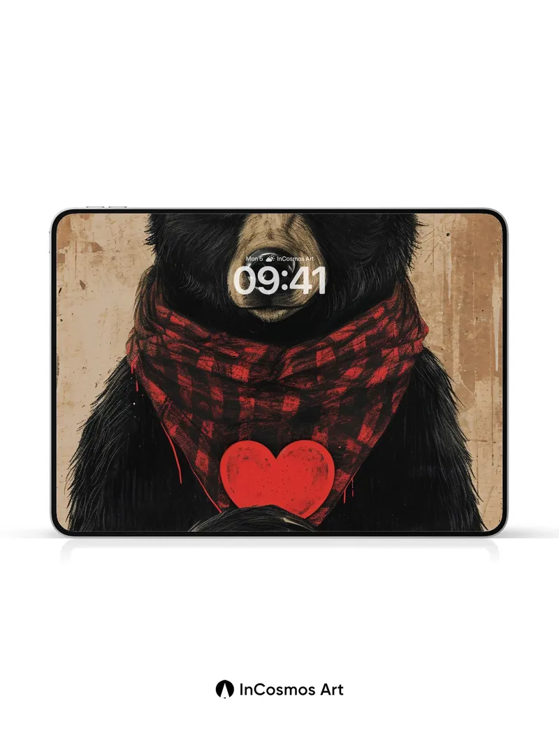 Debug page_description: Did you know bears have a sense of smell 2,100 times stronger than humans? This bear stands solemnly, wrapped in a red-and-black plaid scarf that drapes like a worn cloak over its chest, where a cracked red heart pulses faintly beneath the fur. Light crawls across the textured parchment background, as if time itself is fading around this quiet guardian of emotion. Share this with your best friend. Send this to your love and swap a matching set. Could a heart made of rusted metal still beat for you?