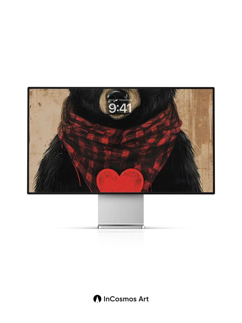 Debug product.metafields.custom.desc: Did you know bears have a sense of smell 2,100 times stronger than humans? This bear stands solemnly, wrapped in a red-and-black plaid scarf that drapes like a worn cloak over its chest, where a cracked red heart pulses faintly beneath the fur. Light crawls across the textured parchment background, as if time itself is fading around this quiet guardian of emotion.