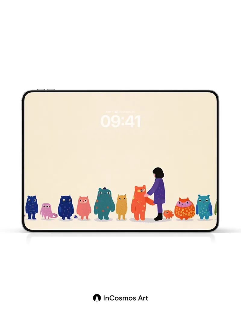Debug page_description: Did you know that in Japanese folklore, owls are seen as messengers of wisdom and protection? Here, a quiet procession of colorful owls marches across a soft beige field, their forms stitched from fabric-like textures that breathe warmth under gentle light. A solitary figure walks beside them, not leading, but listening—each owl a silent story, each hue a memory tucked into the folds of time. Share this with your best friend. Send this to your love and swap a matching set. What if every night, your walls began to walk?