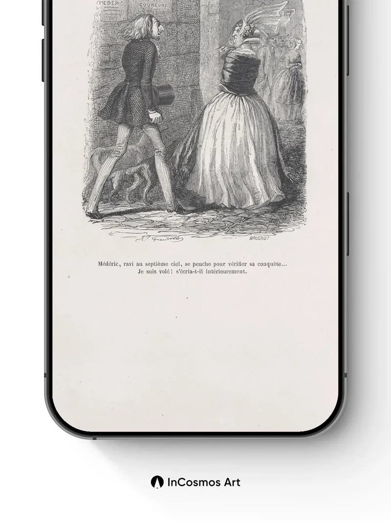 Debug product.metafields.custom.desc: Did you know that 19th-century French lithographs were often hand-colored by artisans using delicate brushes and mineral pigments? This scene, etched in fine black lines, captures a moment where light crawls over textured stone walls and silk-draped figures, their silhouettes dancing between romance and satire. The air hums with quiet tension as a man strides forward, hat in hand, while a woman turns away—her dress flaring like a secret unfolding.