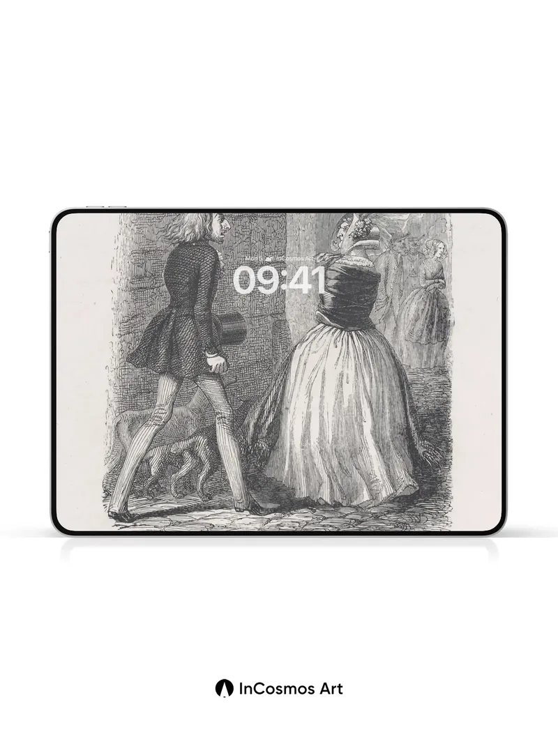 Debug page_description: Did you know that 19th-century French lithographs were often hand-colored by artisans using delicate brushes and mineral pigments? This scene, etched in fine black lines, captures a moment where light crawls over textured stone walls and silk-draped figures, their silhouettes dancing between romance and satire. The air hums with quiet tension as a man strides forward, hat in hand, while a woman turns away—her dress flaring like a secret unfolding. Share this with your best friend. Send this to your love and swap a matching set. What if every glance in this drawing held a story only you could read?