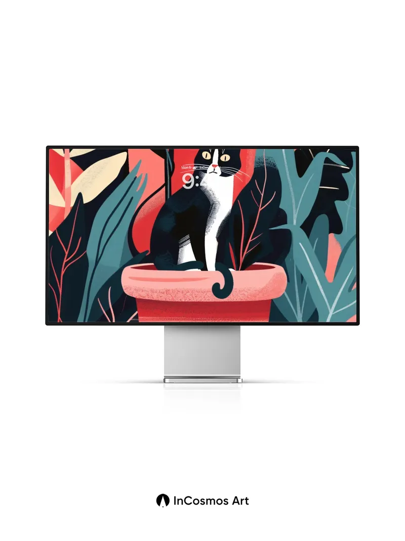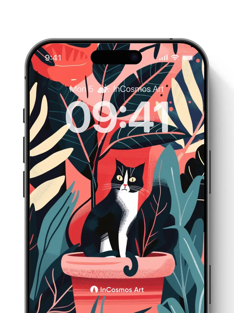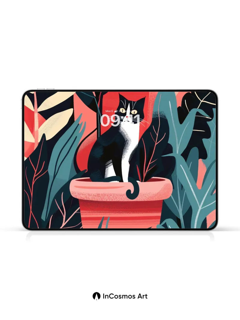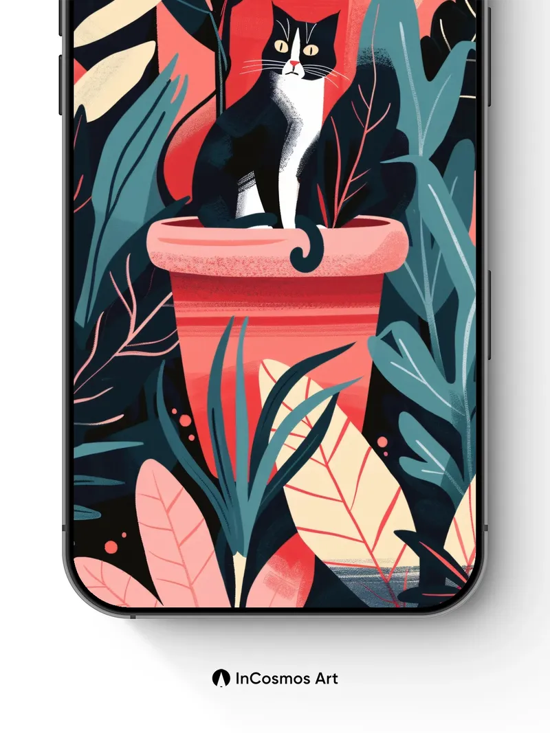 Debug product.metafields.custom.desc: Did you know tuxedo cats are often believed to be lucky charms in folklore? This cat sits regally in a terracotta pot, surrounded by lush tropical leaves that pulse with deep crimson and midnight teal hues, their veins glowing like hidden circuits beneath the surface. The contrast of its sharp white chest against the dark fur feels like a secret whispered in moonlight, while the foliage breathes around it—each leaf a living silhouette.