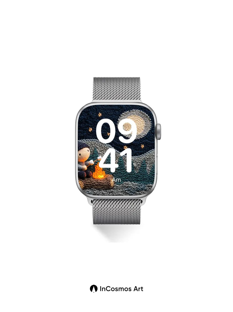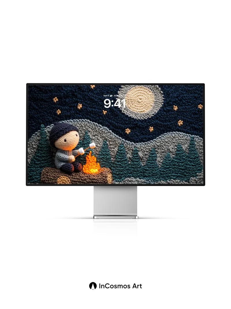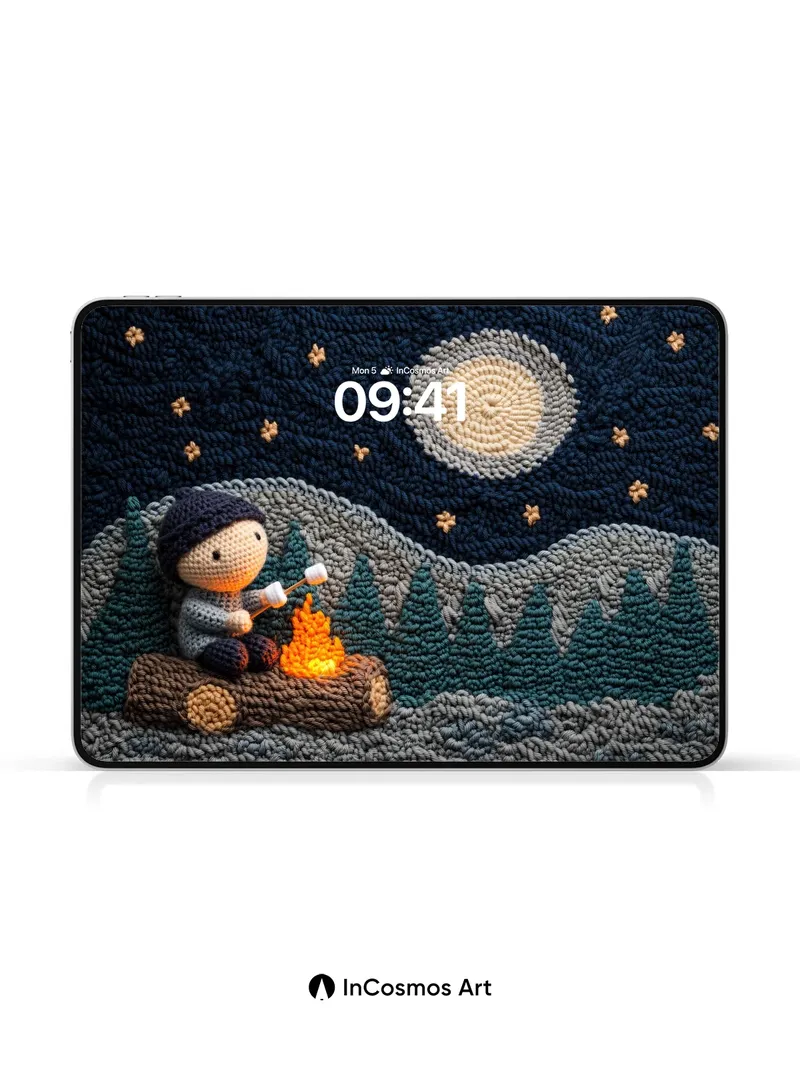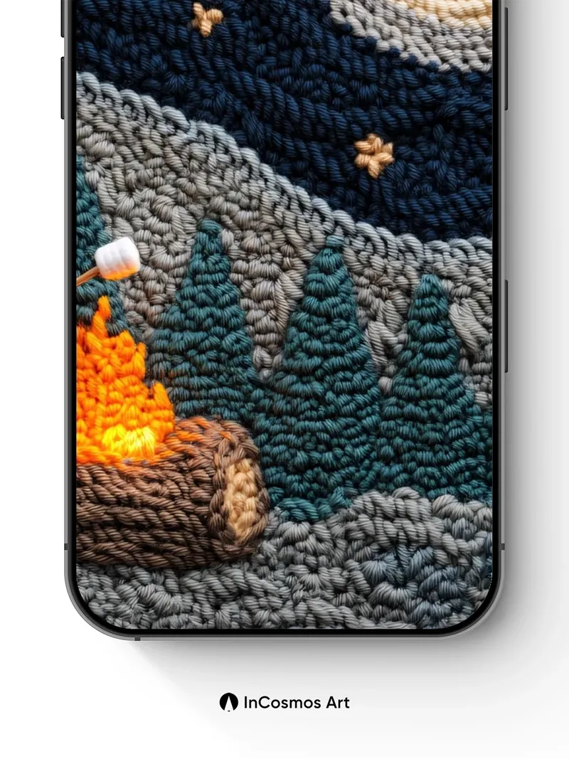 Debug page_description: Did you know hand-knitted textures can trap light like a slow breath? Here, yarn becomes landscape—each stitch a quiet pulse beneath a crocheted moon. The fire flickers not with flame, but with golden thread, casting shadows that curl like dreams across the forested hills. A tiny figure sits on a log, roasting marshmallows under a sky stitched with stars, as if time itself paused to knit this moment. Share this with your best friend. Send this to your love and swap a matching set. What if every night, the world rewound into wool?