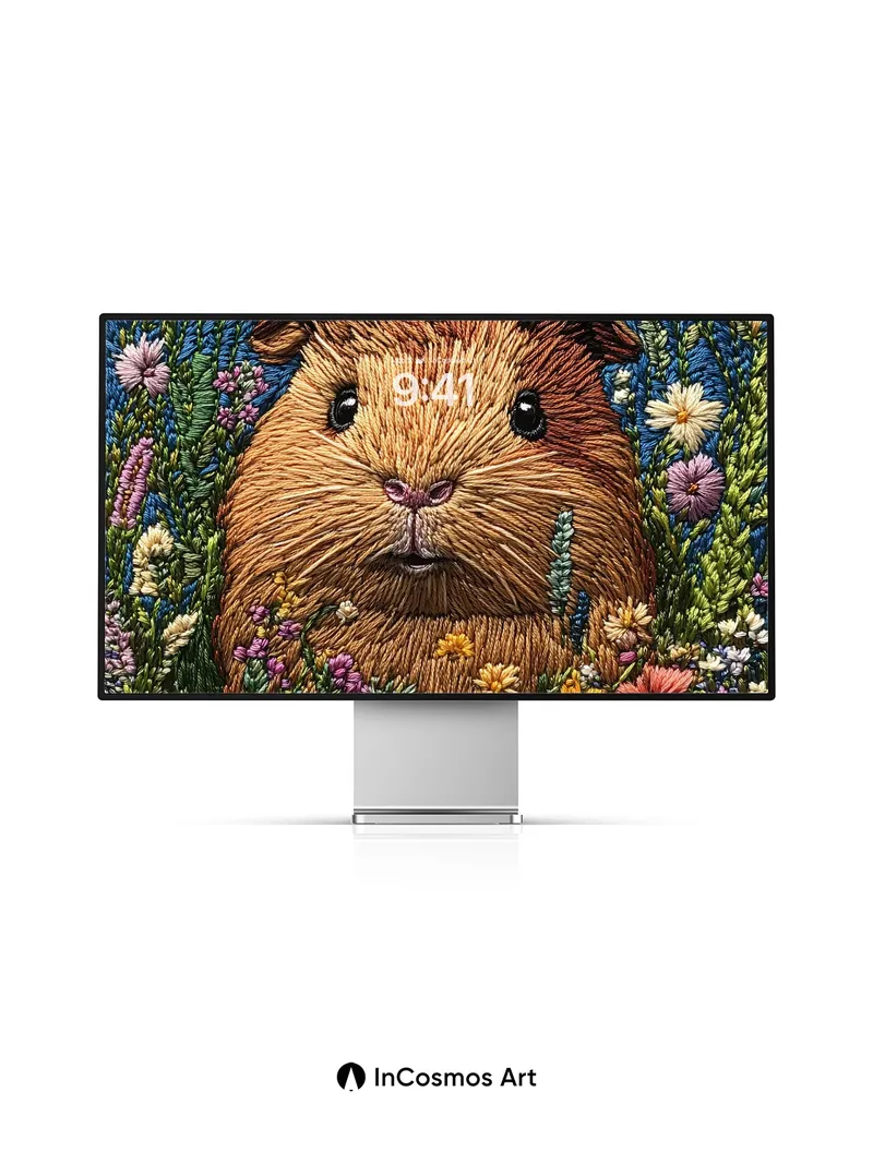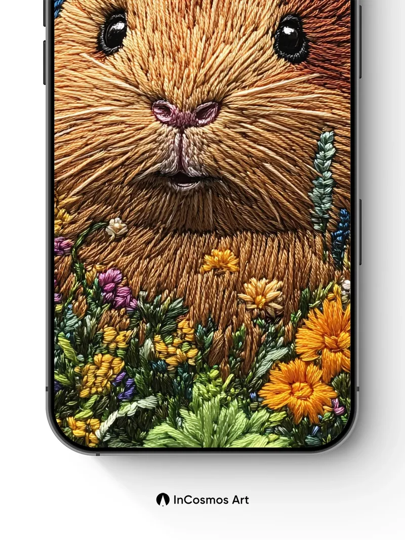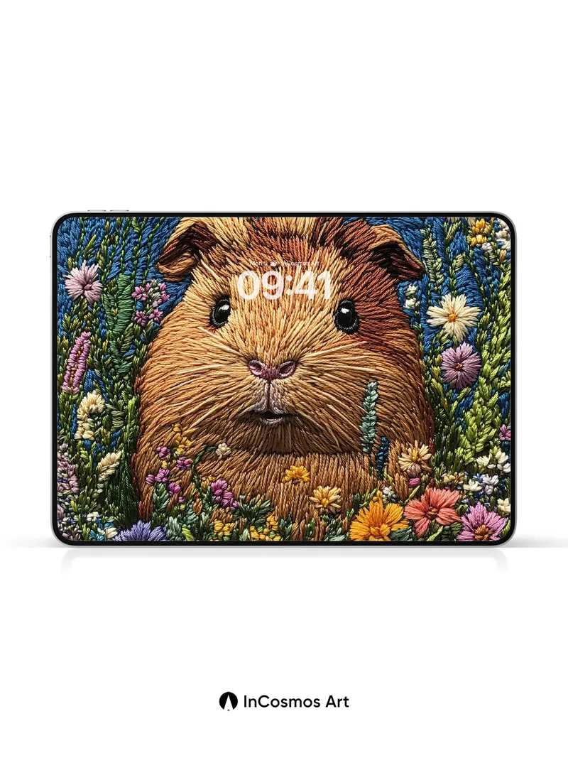 Debug page_description: Did you know that guinea pigs have been domesticated for over 7,000 years, their soft fur once used in ancient Andean textiles? Here, a golden-brown guinea pig peers through a tapestry of wildflowers stitched with such precision that each petal seems to breathe under the weight of sunlight. The threads shimmer like living silk, weaving shadows and light into a garden that feels both timeless and intimate. Share this with your best friend. Send this to your love and swap a matching set. Could your home grow quieter if it held a secret meadow stitched in thread?