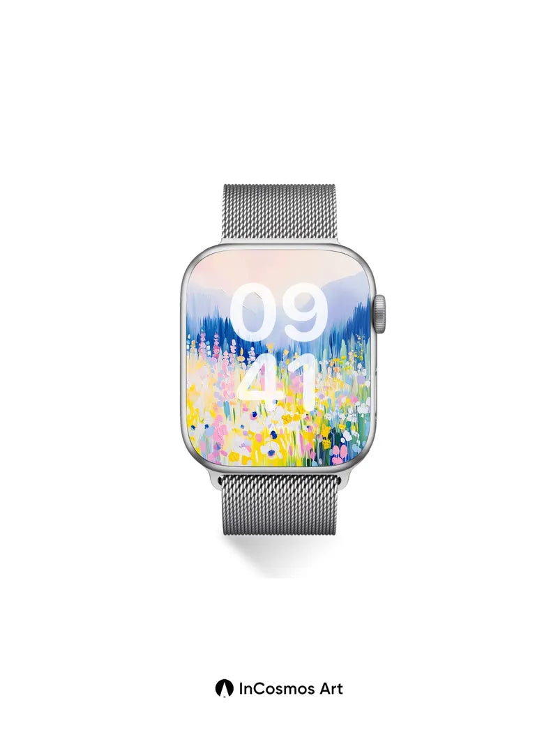 Debug product.metafields.custom.desc: Did you know that wildflower meadows can hold up to 50 species per square meter, each one a tiny burst of color and scent? Here, the blooms pulse like living stains on canvas, their petals glowing as if lit from within by a soft, unseen sun. The distant mountains blur into dreamlike silhouettes, painted in hushed blues and lavender, while the foreground hums with motion—each stroke of paint a breath, a heartbeat.