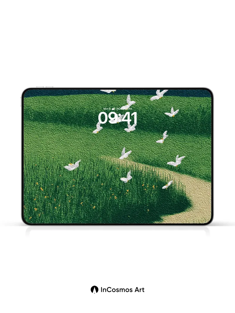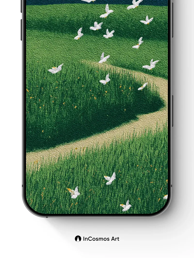 Whispering Meadow Wallpaper with Fluttering Feathers