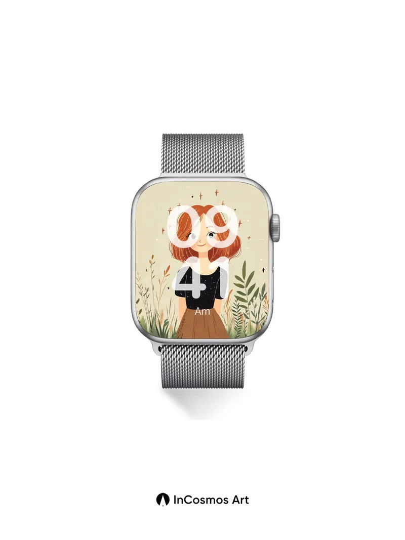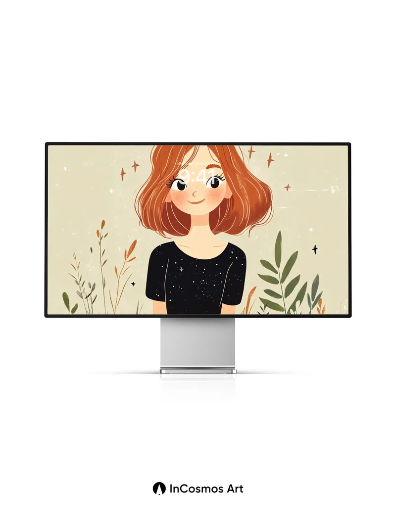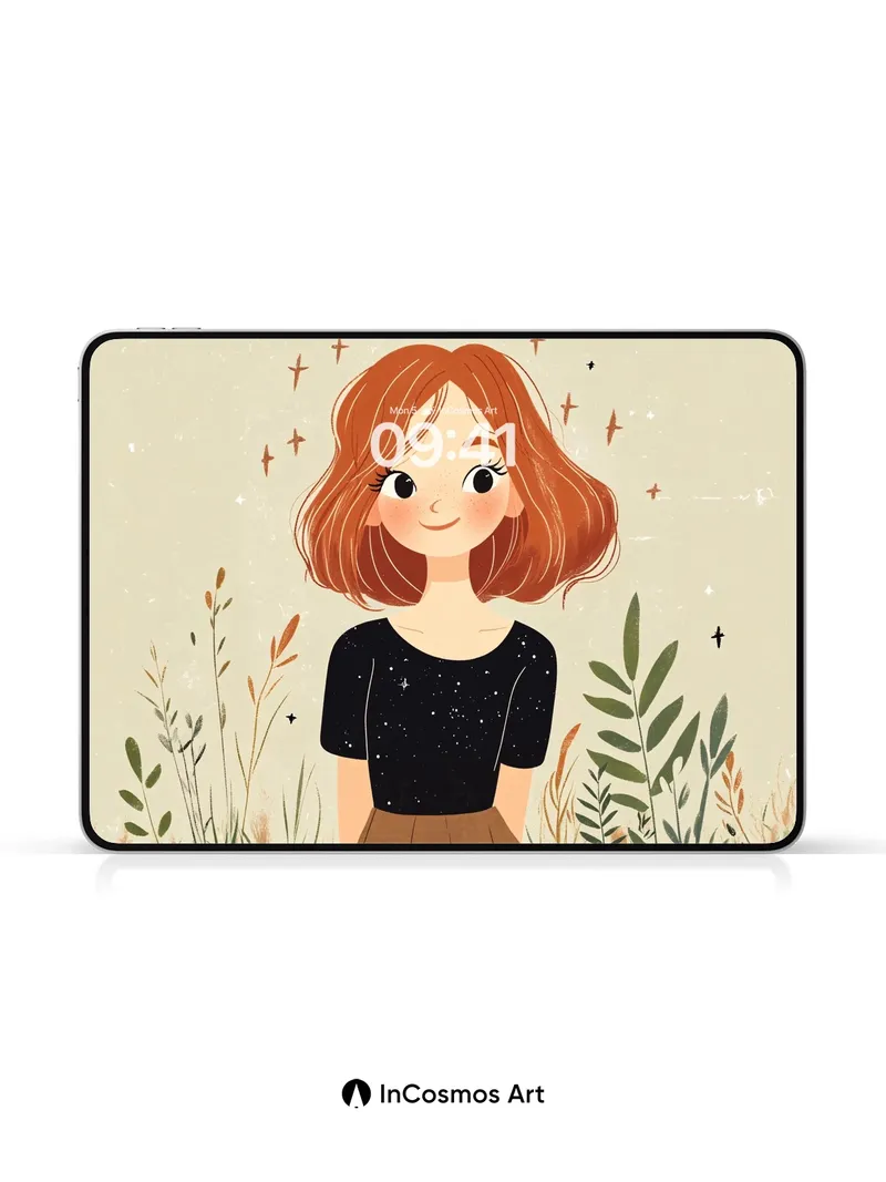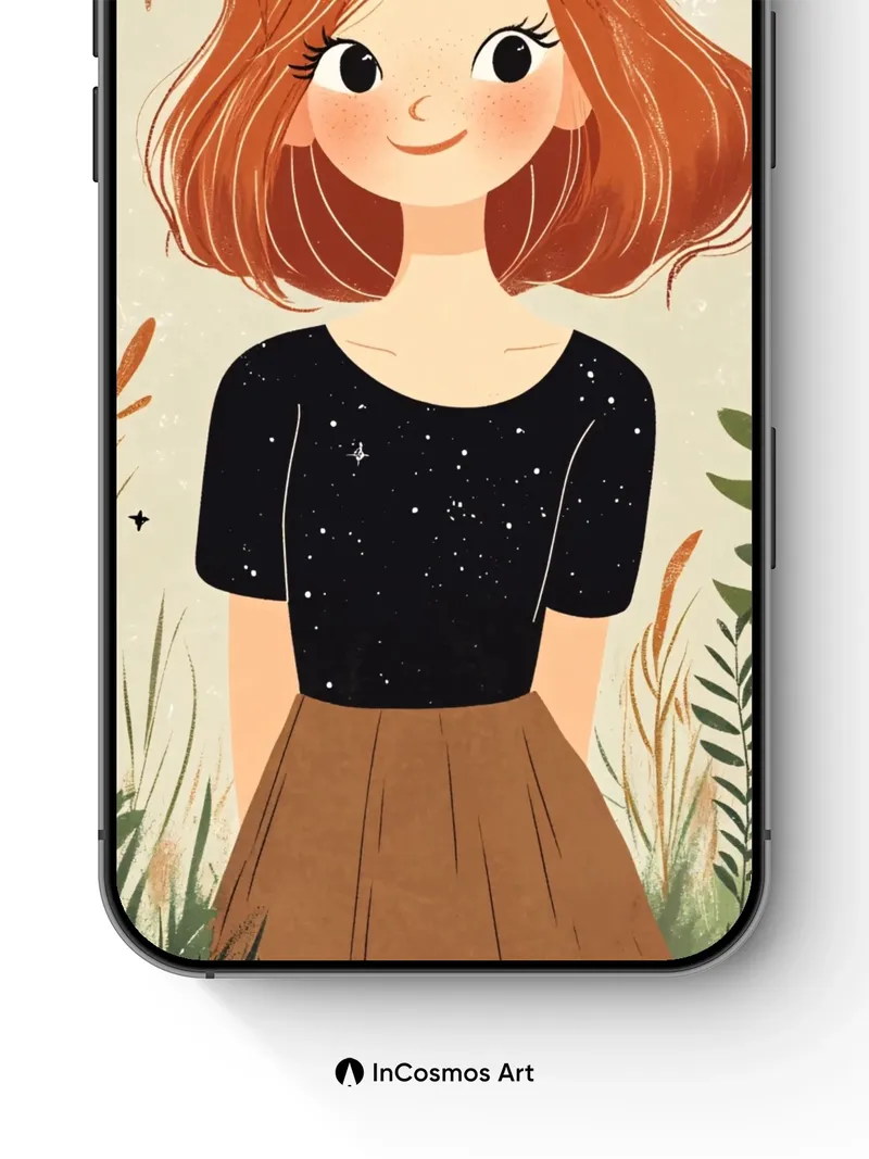 Debug product.metafields.custom.desc: Did you know that red hair contains a pigment called pheomelanosin, which glows under moonlight like scattered embers? In this illustration, the girl’s auburn curls float above wild grasses, each strand catching the soft sparkle of tiny stars that drift like fireflies through the air. Her black top is dotted with constellations—tiny galaxies stitched into fabric—while the breeze lifts her skirt as if nature itself is breathing around her.