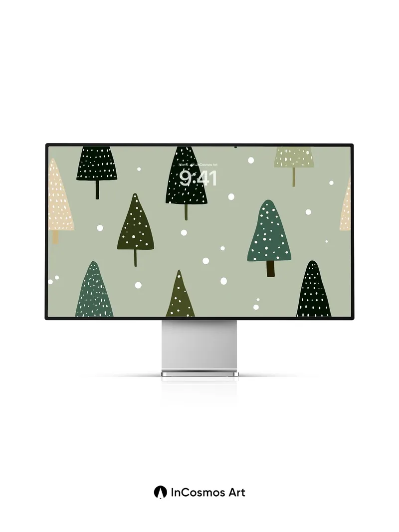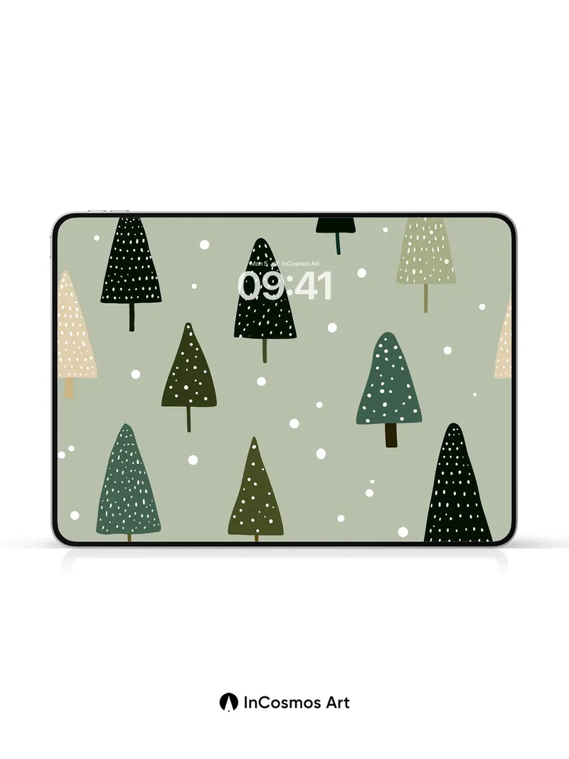 Debug product.metafields.custom.desc: Did you know that each pine tree in this pattern is hand-drawn with a single brushstroke, its needles whispering secrets to the soft mint backdrop? White specks drift like silent snowflakes, settling on trunks of earthy brown and forest green—each one a tiny world holding breath. The trees stand close but never touch, creating a quiet rhythm that feels both ancient and new.