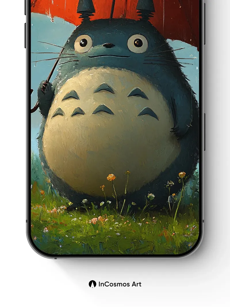 Debug og_description: Did you know Studio Ghibli’s Totoro was inspired by a Japanese folklore creature believed to bring rain? Here, he stands in a meadow where droplets hang like pearls from the sky, and light spills through clouds like soft silk. His fur is damp, puffed with quiet dignity, as if holding breath between thunderstorms. The red umbrella—bold, almost surreal—casts a warm glow against the cool blue haze, making him feel both grounded and magical.