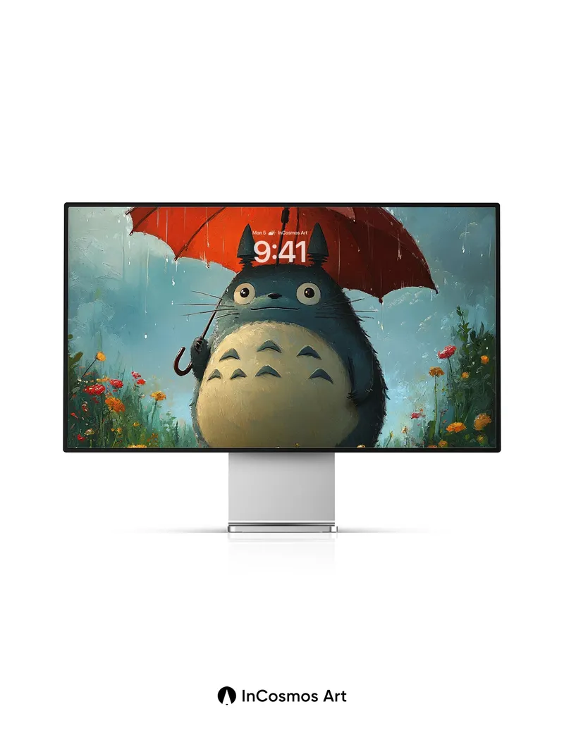 Debug product.metafields.custom.desc: Did you know Studio Ghibli’s Totoro was inspired by a Japanese folklore creature believed to bring rain? Here, he stands in a meadow where droplets hang like pearls from the sky, and light spills through clouds like soft silk. His fur is damp, puffed with quiet dignity, as if holding breath between thunderstorms. The red umbrella—bold, almost surreal—casts a warm glow against the cool blue haze, making him feel both grounded and magical.