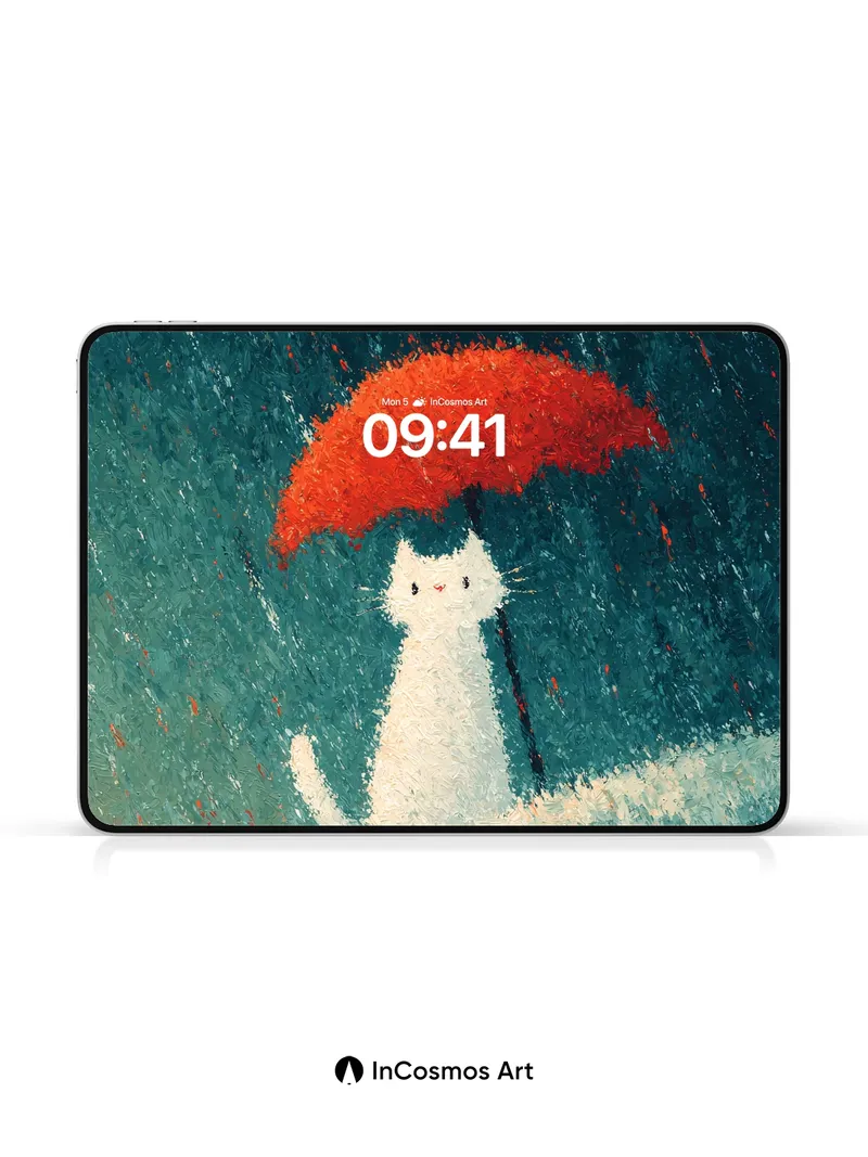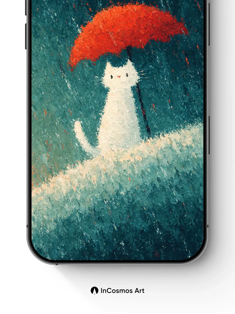 Whispering Rain Wallpaper with Red Umbrella Cat