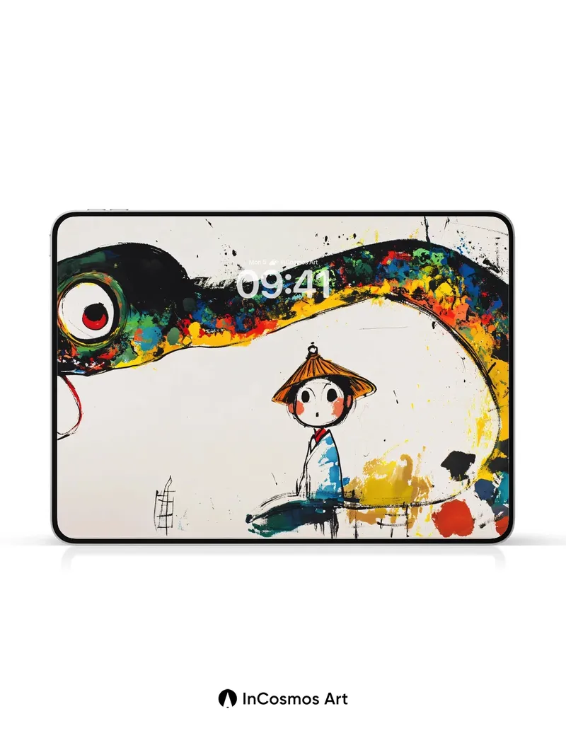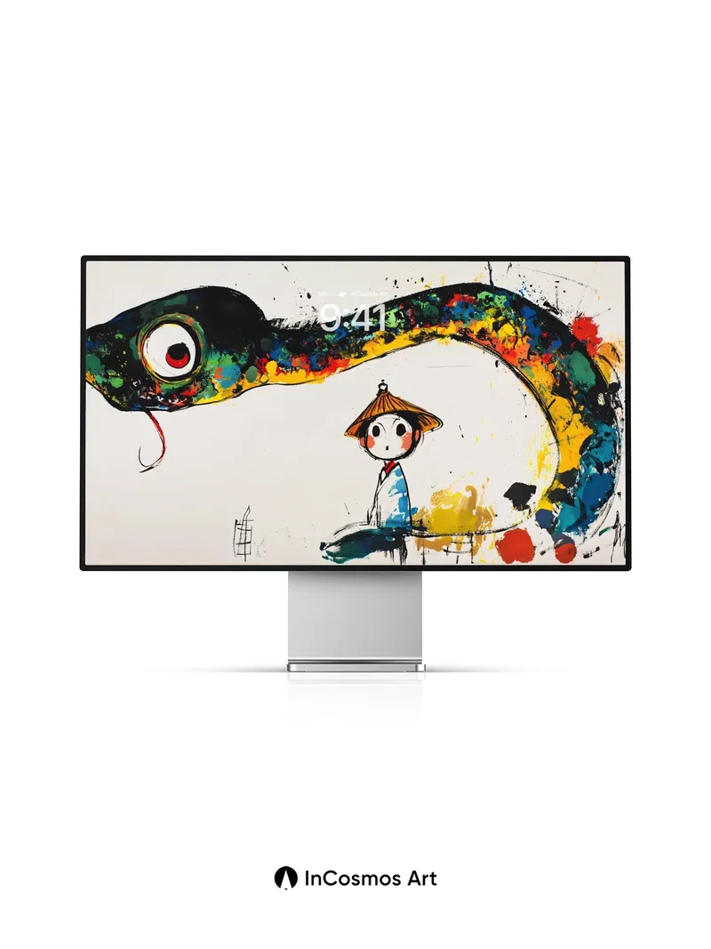 Debug product.metafields.custom.desc: Did you know that in ancient folklore, snakes were believed to carry dreams through the earth’s veins? Here, a colossal serpent of swirling rainbow hues coils like liquid light, its scales shimmering with the texture of crushed gemstones and inkblot memories. At its curve, a small figure in a straw hat sits quietly, eyes wide—unafraid, as if they’ve always known this creature was a guardian of silent stories.