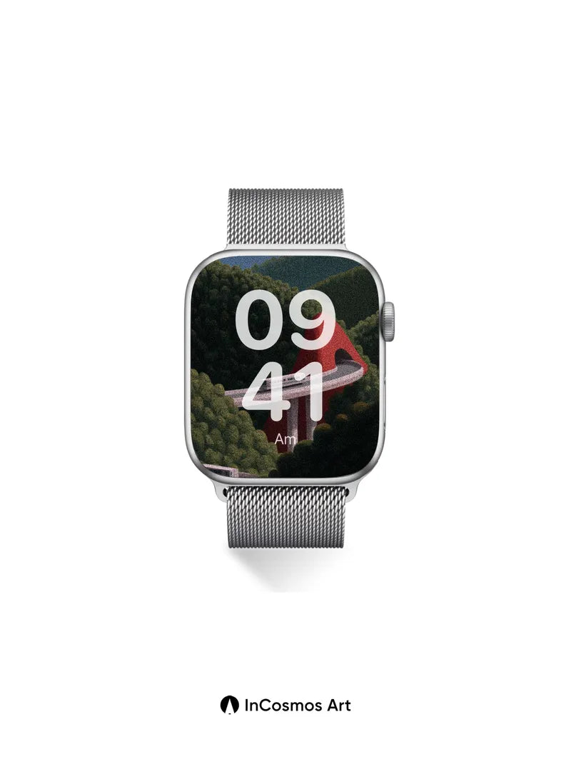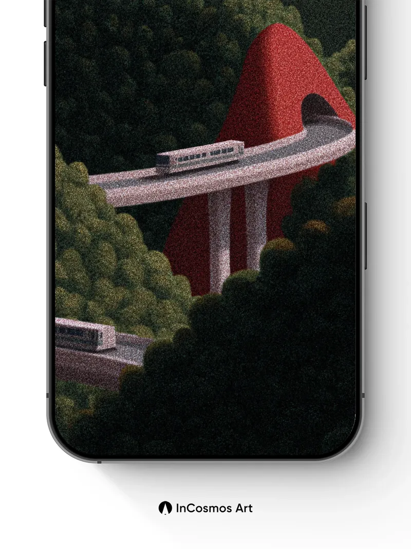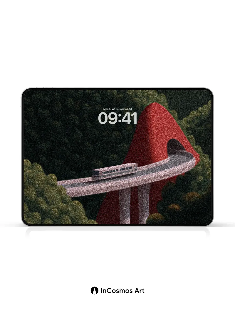 Debug product.metafields.custom.desc: Did you know that the red arch in this scene is inspired by the iconic design of Japanese torii gates, reimagined as a bridge through time? Light crawls over the smooth concrete rails like a silent traveler, while the forest breathes in deep emerald waves beneath a twilight sky. The train glides not just across terrain, but through memory—its silver shell reflecting a world suspended between dream and reality.