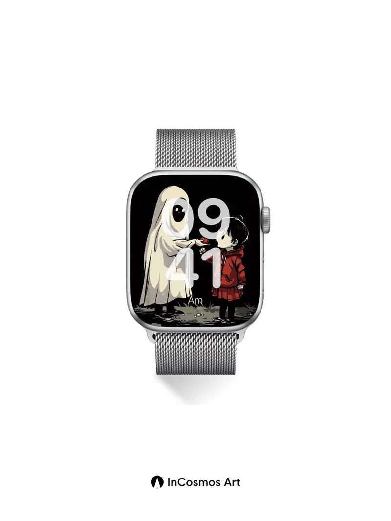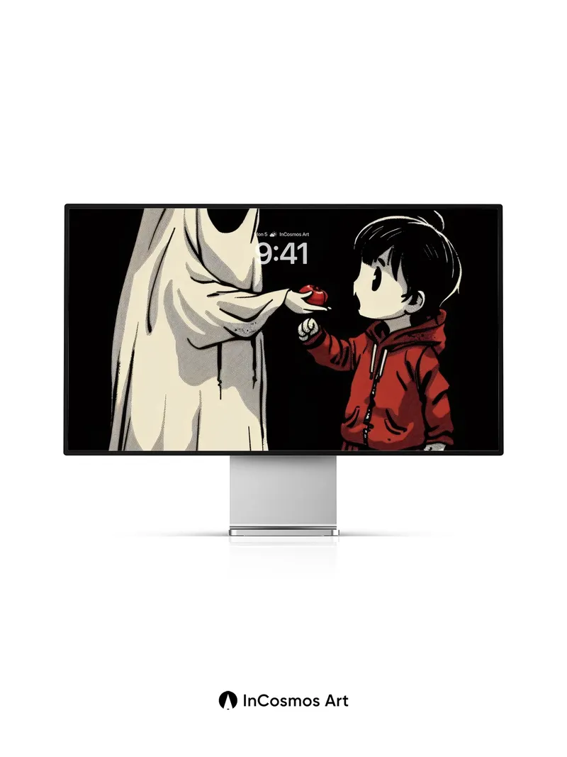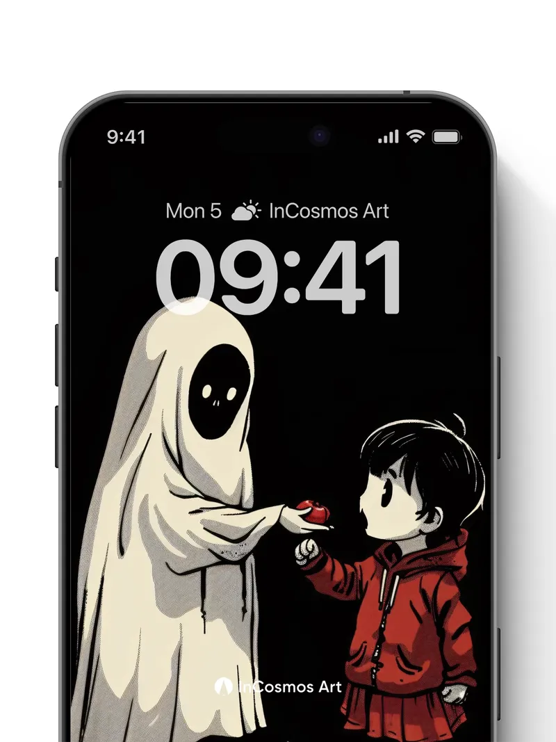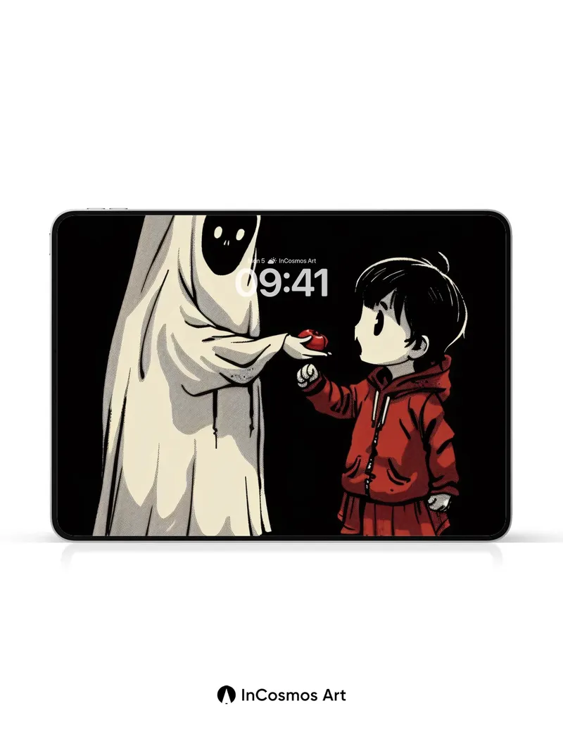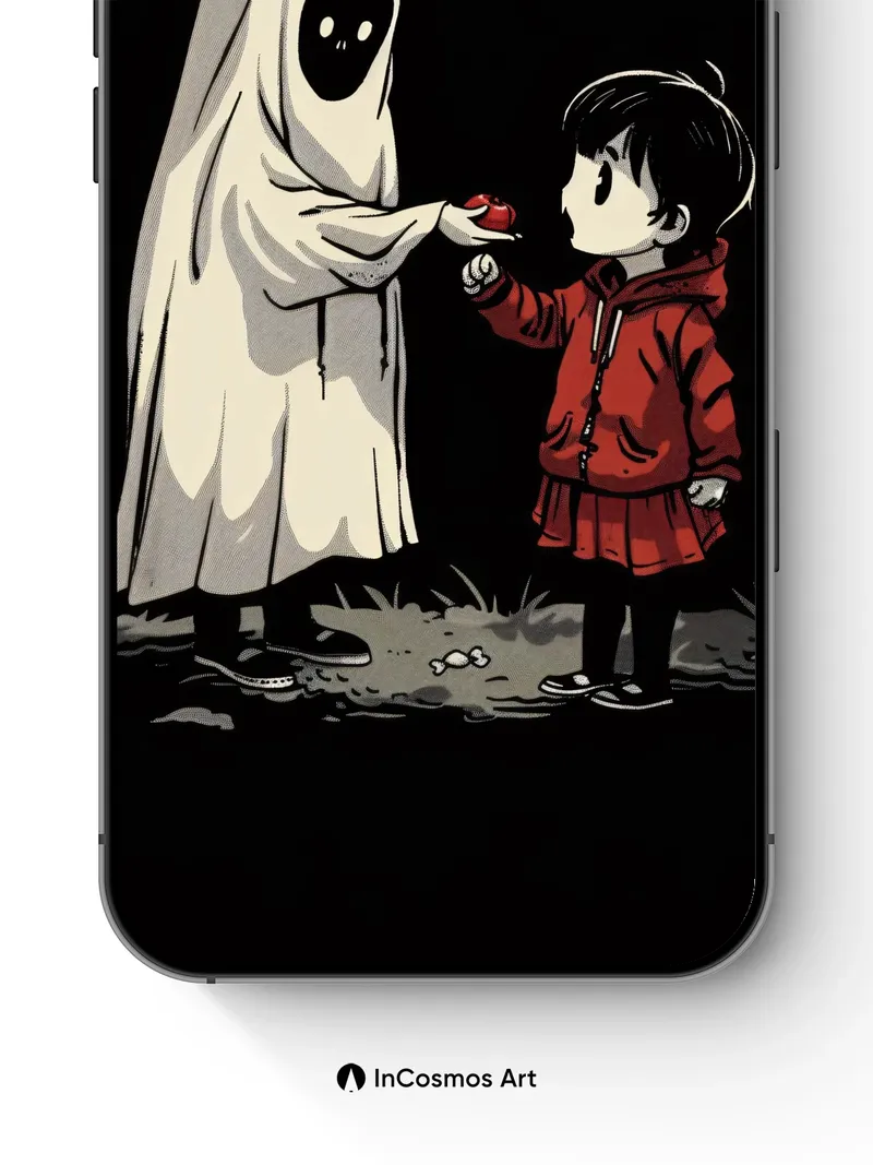 Debug page_description: Did you know that in ancient folklore, the first apple offered by a spirit was said to carry forgotten memories? Here, light crawls over the ghostly fabric like cold breath, while the child’s red coat pulses with quiet defiance against the dark. The ground beneath them is cracked earth and scattered bones, yet the moment feels suspended—neither fear nor joy, but something deeper: a silent pact between worlds. Share this with your best friend. Send this to your love and swap a matching set. What if the apple wasn’t poison, but a key?
