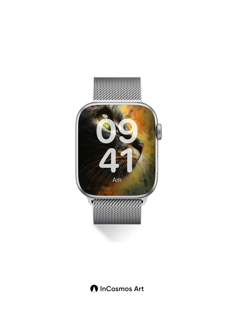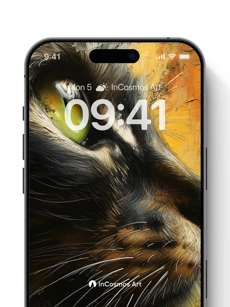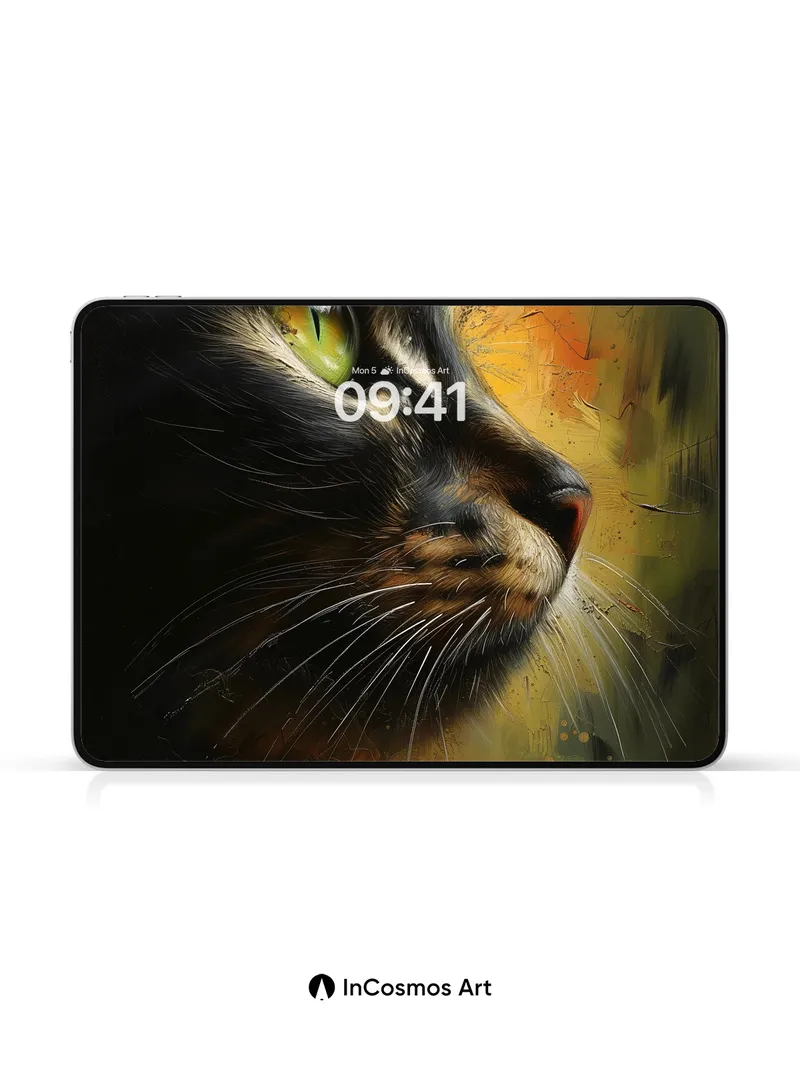 Debug product.metafields.custom.desc: Did you know a cat’s pupils can dilate to nearly fill their entire eye in dim light? Here, the feline’s emerald iris glows like molten glass against a storm of golden ochre and charcoal smudges, where texture breathes like smoke on canvas. You feel the weight of silence in its profile—each whisker a fine thread of stillness, the fur a whisper of midnight velvet, as if the night itself has paused to watch.