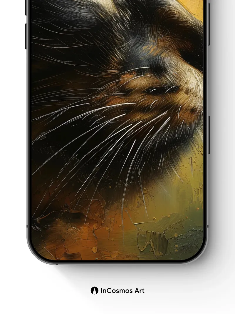 Did you know a cat’s pupils can dilate to nearly fill their entire eye in dim light? Here, the feline’s emerald iris glows like molten glass against a storm of golden ochre and charcoal smudges, where texture breathes like smoke on canvas. You feel the weight of silence in its profile—each whisker a fine thread of stillness, the fur a whisper of midnight velvet, as if the night itself has paused to watch.