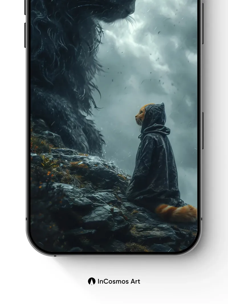 Did you know that in ancient folklore, cats were believed to carry the souls of forgotten guardians? Here, a storm-wracked sky frames a colossal feline whose fur crackles like dark thunderclouds, while a small cloaked cat sits below, eyes lifted in silent communion. Light bleeds from its amber gaze, casting long shadows that crawl across jagged stone like memory itself.
