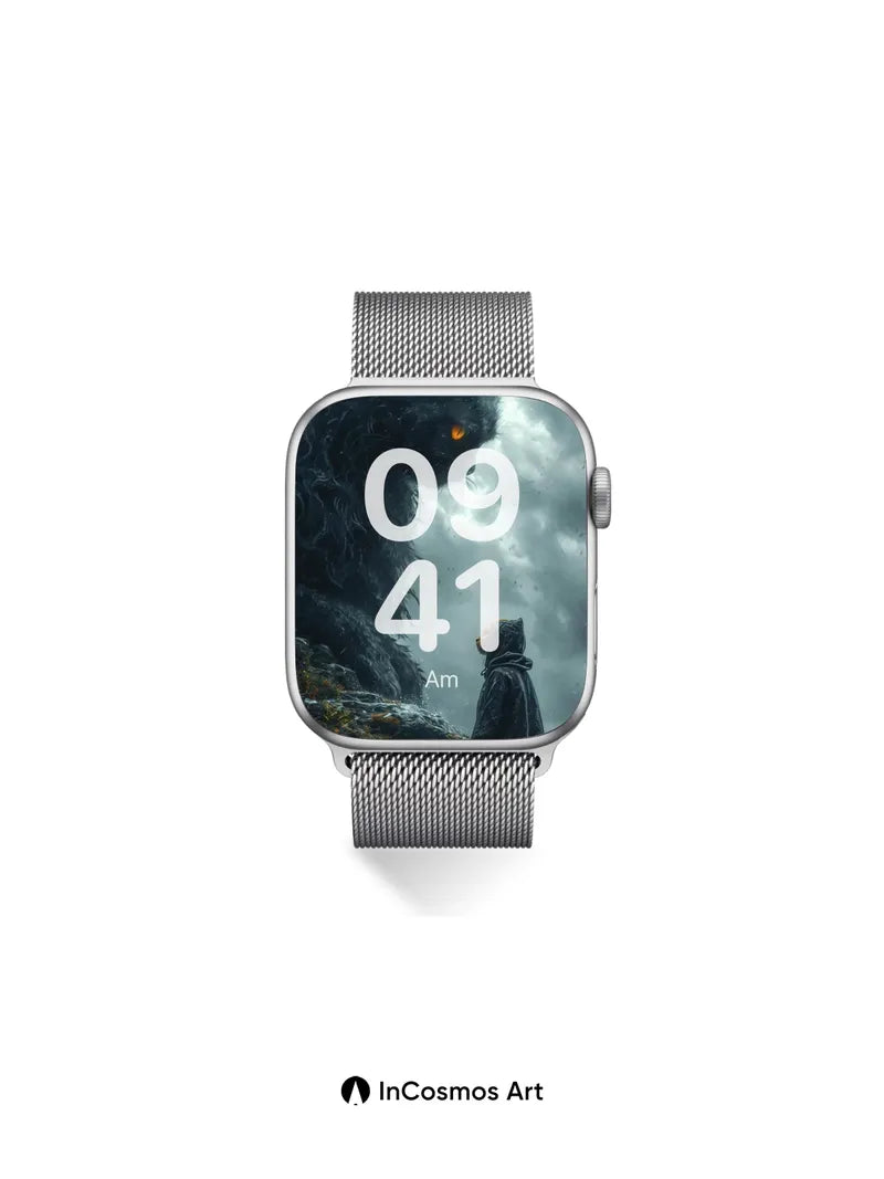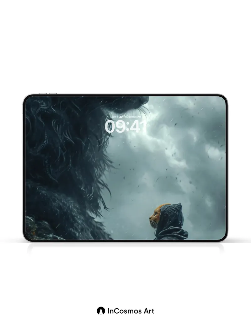 Debug product.metafields.custom.desc: Did you know that in ancient folklore, cats were believed to carry the souls of forgotten guardians? Here, a storm-wracked sky frames a colossal feline whose fur crackles like dark thunderclouds, while a small cloaked cat sits below, eyes lifted in silent communion. Light bleeds from its amber gaze, casting long shadows that crawl across jagged stone like memory itself.