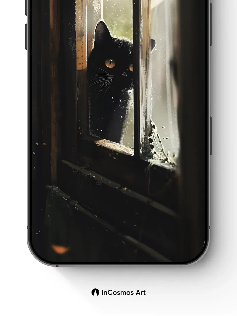 Debug product.metafields.custom.desc: Did you know cats can see in near-complete darkness, their eyes reflecting light like tiny mirrors? This black feline peers through a weathered windowpane, where dust motes dance in golden shafts of light and the glass holds the ghost of raindrops. The wooden frame cracks like old parchment, framing a moment suspended between worlds—inside and out, silence and watchfulness.