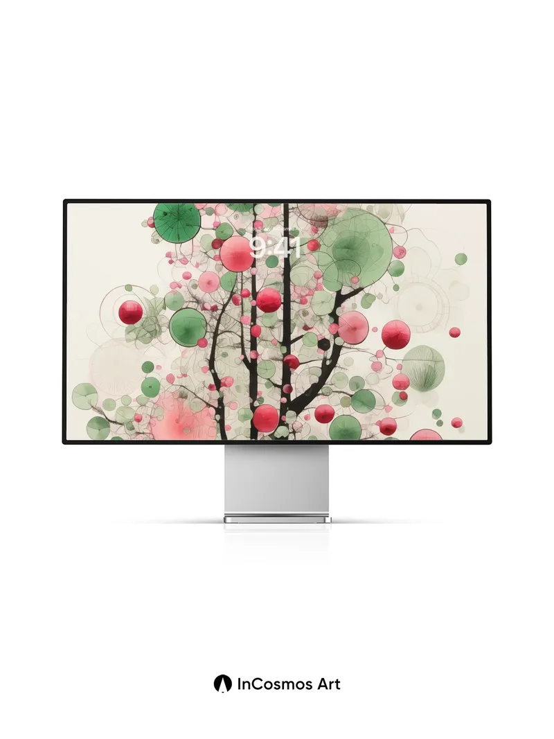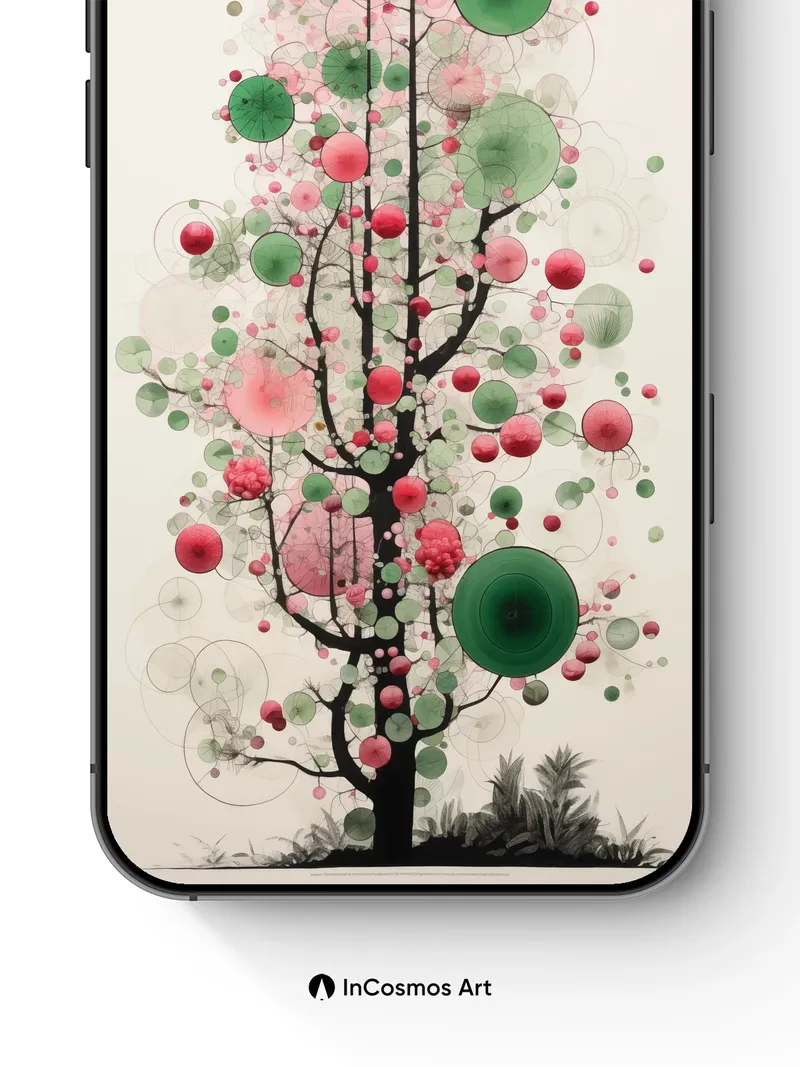 Debug product.metafields.custom.desc: Did you know that in ancient Japanese gardens, floating orbs were believed to hold the breath of nature? Here, translucent spheres pulse like living cells, suspended in a vertical forest of ink-black branches and soft coral haze. Each circle hums with quiet energy, as if light itself is growing inside them—green veins pulsing through pink membranes, a tree not of wood but of thought and air.