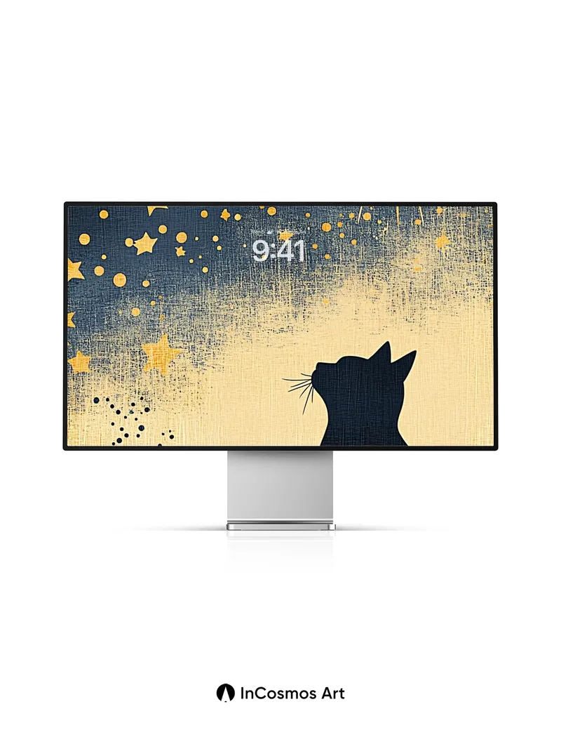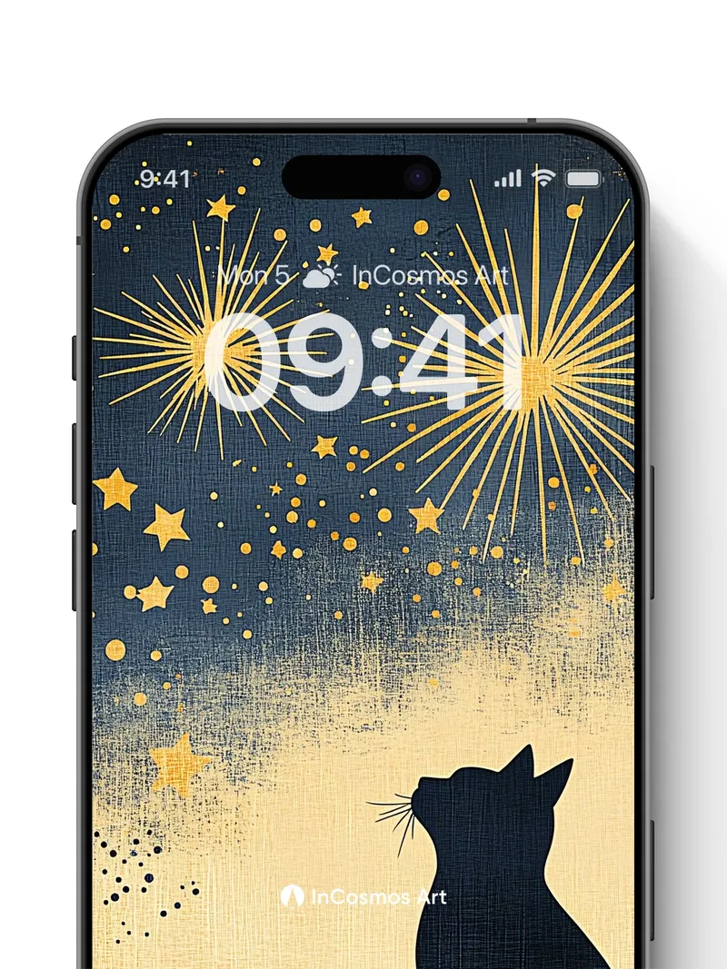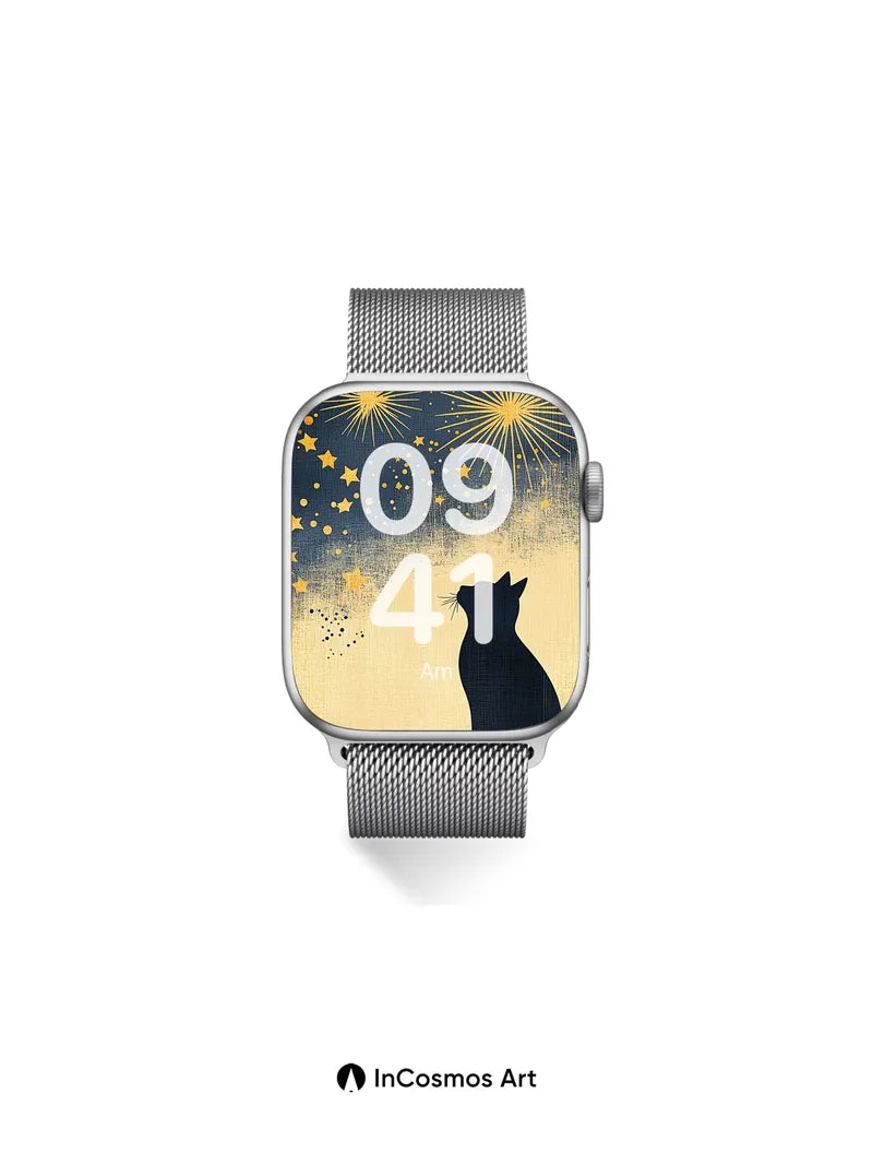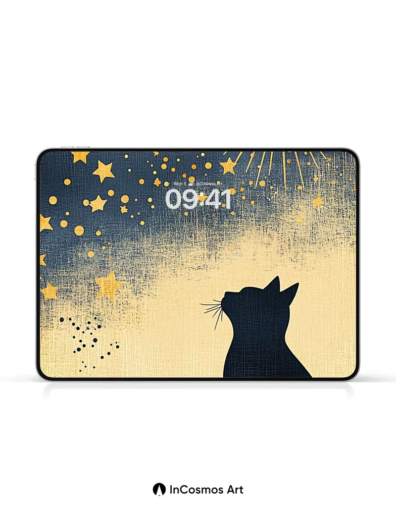 Debug product.metafields.custom.desc: Did you know that cats can see in near-complete darkness, their eyes capturing the faintest glimmers like constellations? This silhouette watches a sky where gold bursts bloom like celestial fireworks, each star a tiny spark of memory. The texture breathes like aged linen, brushed with midnight and stardust, as if the night itself is whispering secrets only the quiet observer can hear.