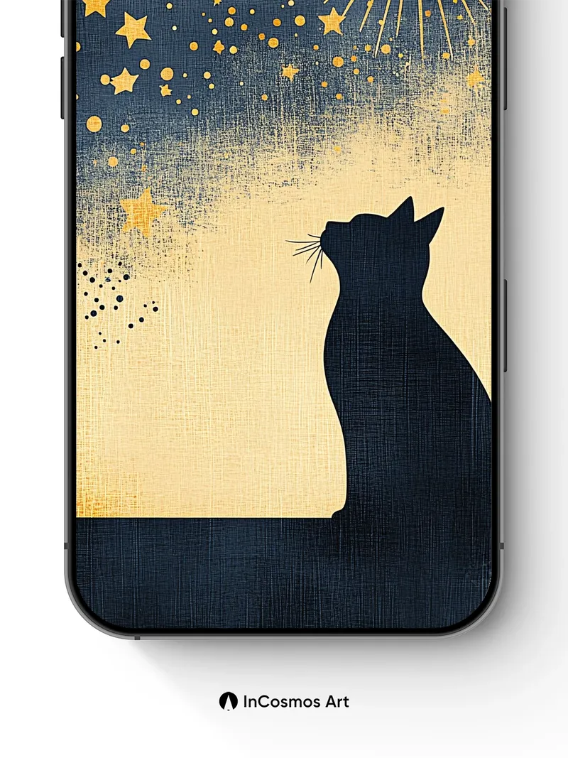 Did you know that cats can see in near-complete darkness, their eyes capturing the faintest glimmers like constellations? This silhouette watches a sky where gold bursts bloom like celestial fireworks, each star a tiny spark of memory. The texture breathes like aged linen, brushed with midnight and stardust, as if the night itself is whispering secrets only the quiet observer can hear.