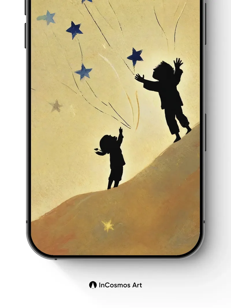 Debug page_description: Did you know that in ancient cultures, stars were believed to be fallen fragments of divine light? Here, they float like kites tethered to the sky, their threads drawn by two silhouetted children on a golden hill. The warm ochre canvas breathes like aged parchment, while the stars—painted in deep indigo and soft teal—glow with quiet magic. You feel the weightlessness of reaching upward, not just toward the heavens, but into memory’s tender glow. Share this with your best friend. Send this to your love and swap a matching set. What if every star you caught became a wish that never faded?