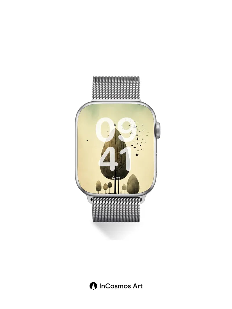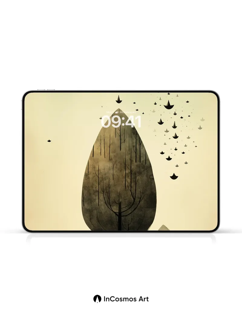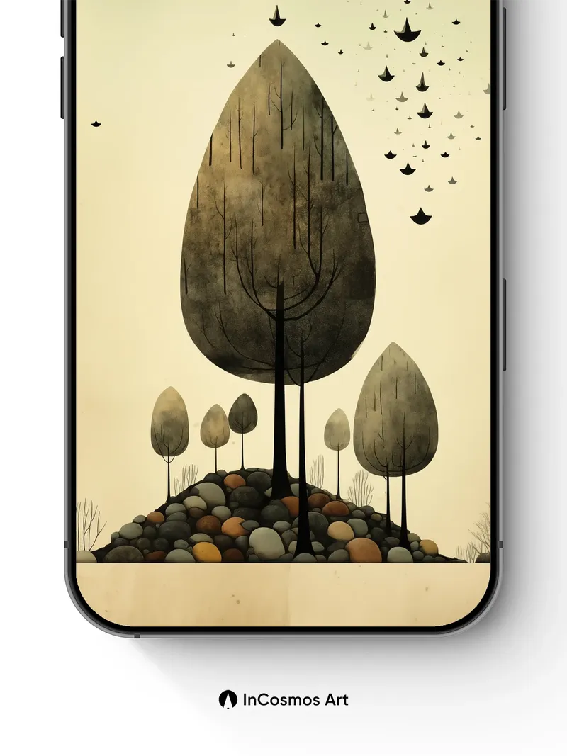 Whispering Stone Trees Wallpaper with Flying Silhouettes