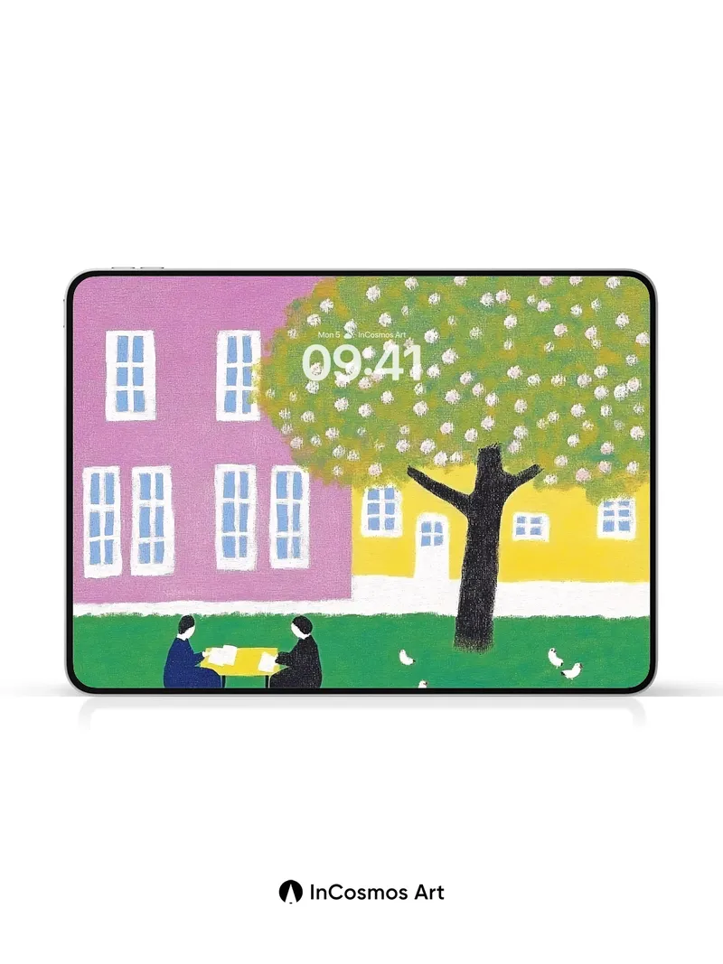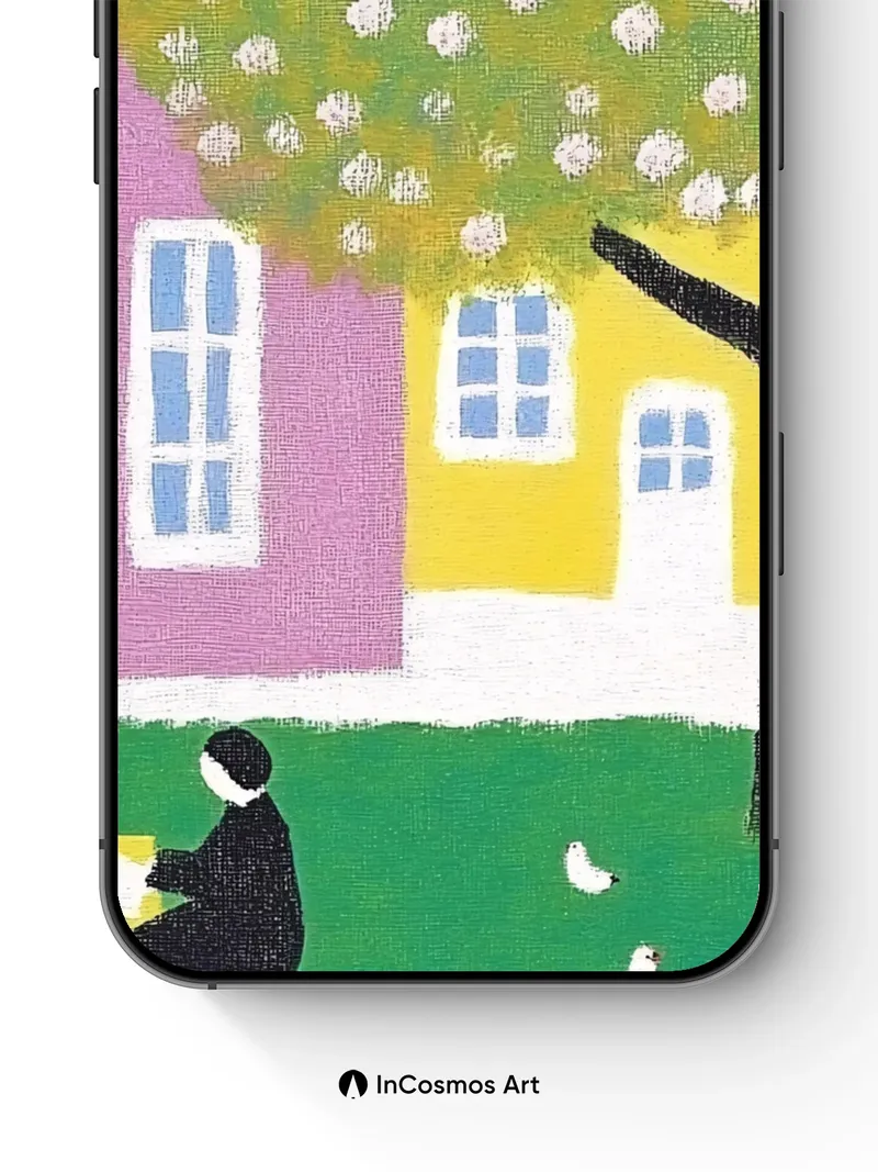 Debug product.metafields.custom.desc: Did you know that in Japanese folklore, cherry trees speak to those who sit beneath them at dawn? Here, a solitary tree breathes soft white blossoms into the air, its dark silhouette stretching like a hand toward the sky. Two figures huddle over a yellow table in the green lawn, their forms quiet and close, as if sharing secrets only the wind could carry. The pink and yellow buildings behind them stand like painted dreams, windows glowing with stillness.