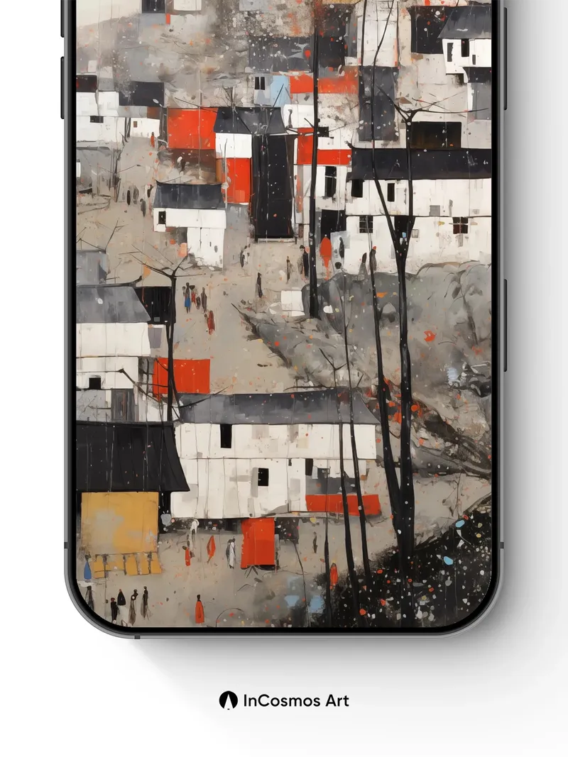 Debug page_description: Did you know that ancient Chinese ink paintings used water ratios to create depth, much like the translucent washes here? Bare trees rise like dark fingers through a village of fractured whites and rust-red accents, where color breathes through cracked plaster walls and scattered figures walk under a sky stained with autumnal dust. The light crawls over rooftops like memory, softening edges into quiet stories. Share this with your best friend. Send this to your love and swap a matching set. What if every house held a secret whispered only in winter?