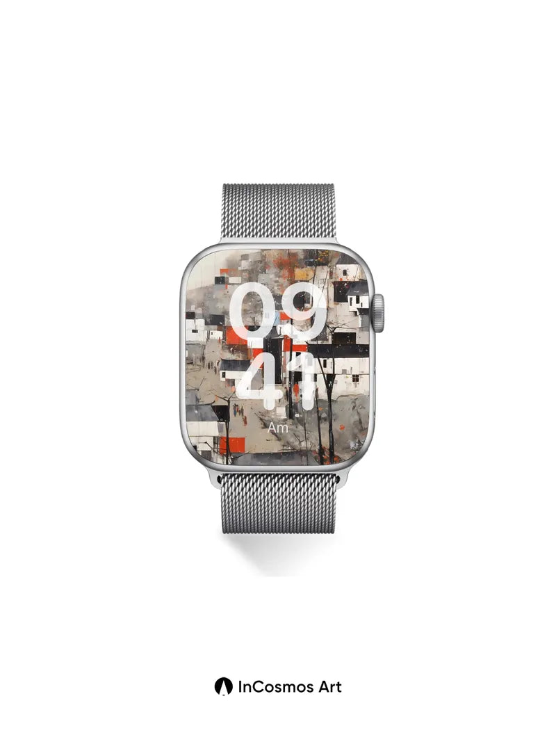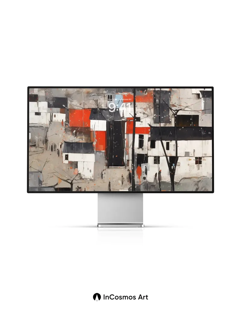Debug product.metafields.custom.desc: Did you know that ancient Chinese ink paintings used water ratios to create depth, much like the translucent washes here? Bare trees rise like dark fingers through a village of fractured whites and rust-red accents, where color breathes through cracked plaster walls and scattered figures walk under a sky stained with autumnal dust. The light crawls over rooftops like memory, softening edges into quiet stories.