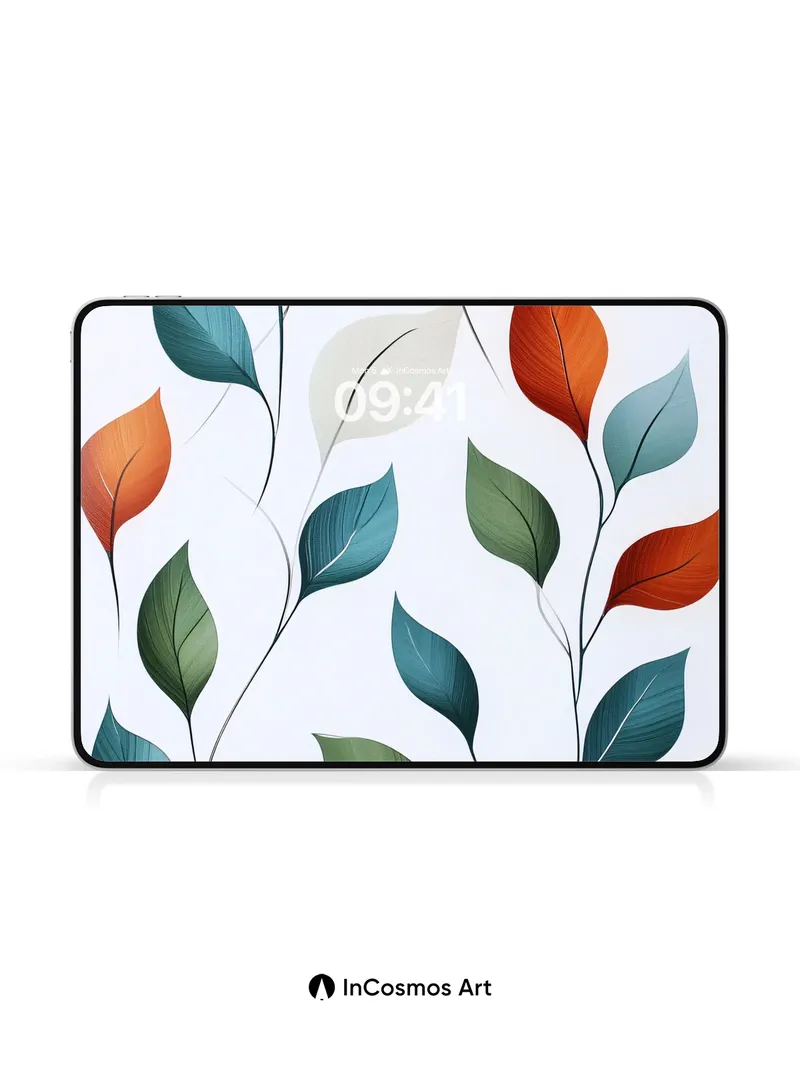 Debug page_description: Did you know that leaves in nature change color due to chlorophyll breakdown, revealing hidden pigments like carotenoids and anthocyanins? Here, each leaf glows as if lit from within, veins tracing delicate pathways across a soft, cloud-like backdrop. The contrast between warm rusts and cool teals feels alive, like breath caught in still air—quiet yet electric. Share this with your best friend. Send this to your love and swap a matching set. What if every wall could remember the season it once lived in?