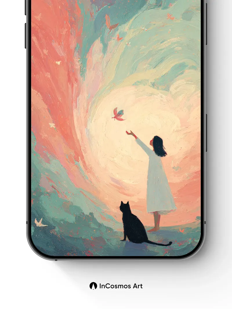 Did you know that in ancient Japanese art, the swirling sky was believed to carry spirits between worlds? Here, color breathes through a spiral of coral and teal, where butterflies flutter like forgotten memories and light crawls over painted waves. A girl reaches into the void, her silhouette framed by a black cat watching in quiet reverence—this moment feels both infinite and intimate.