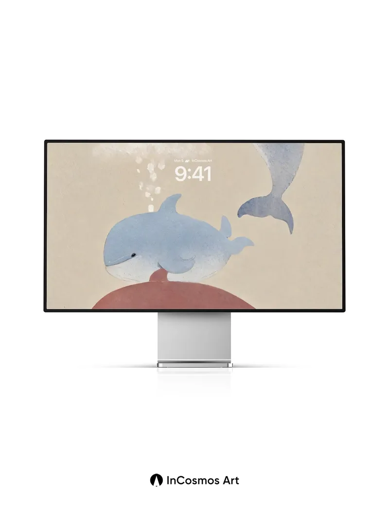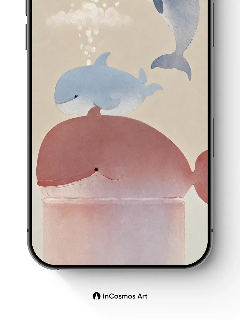 Debug product.metafields.custom.desc: Did you know whales communicate over hundreds of miles using low-frequency songs that echo through ocean trenches? Here, a coral-hued whale rests atop a pillar like a stone monument, while two smaller whales leap above in soft watercolor hues, one exhaling a cloud of shimmering bubbles that rise like stars. The scene breathes quiet wonder—where gravity bends and marine myths float just beyond the edge of sight.