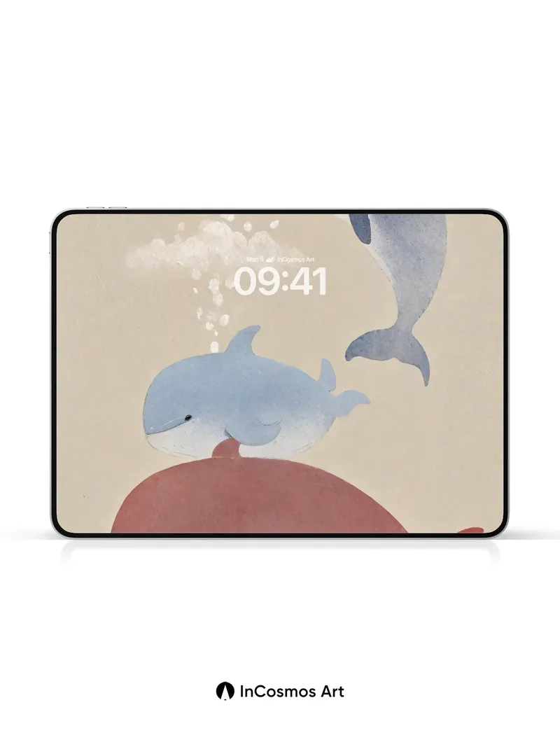 Debug page_description: Did you know whales communicate over hundreds of miles using low-frequency songs that echo through ocean trenches? Here, a coral-hued whale rests atop a pillar like a stone monument, while two smaller whales leap above in soft watercolor hues, one exhaling a cloud of shimmering bubbles that rise like stars. The scene breathes quiet wonder—where gravity bends and marine myths float just beyond the edge of sight. Share this with your best friend. Send this to your love and swap a matching set. What if every breath underwater carried a story waiting to be heard?