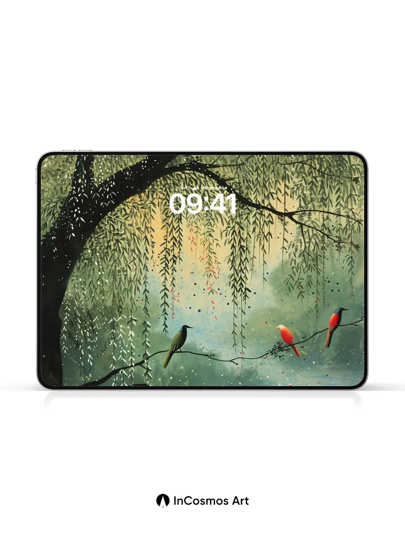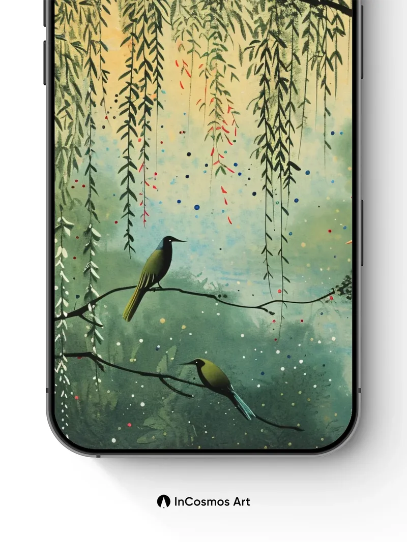 Debug page_description: Did you know willow branches once held sacred meaning in ancient rituals, believed to carry the whispers of forgotten spirits? Here, they drape like liquid emerald threads over a mist-laden lake, where birds of iridescent green and crimson rest as if suspended in time, their feathers catching the soft glow of a hidden sun. The air hums with quiet magic—each droplet of dew on the leaves refracts light into tiny rainbows, while the water below breathes beneath a veil of fog. Share this with your best friend. Send this to your love and swap a matching set. What if the trees remembered every song the wind ever sang?