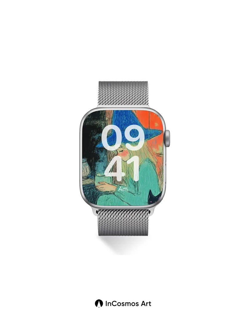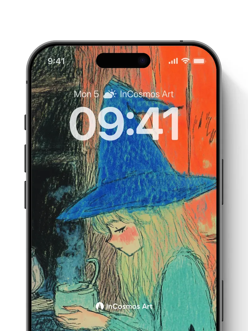 Debug product.metafields.custom.desc: Did you know that in ancient folklore, witches brewed potions under the light of a waxing moon? Here, the blue-brimmed hat casts a soft shadow over her face as steam curls from the mug like breath in winter—her fingers wrapped around warmth, while the black cat watches with eyes like embered coals. The wall behind her bleeds rust and fire, yet she remains calm, untouched by time.