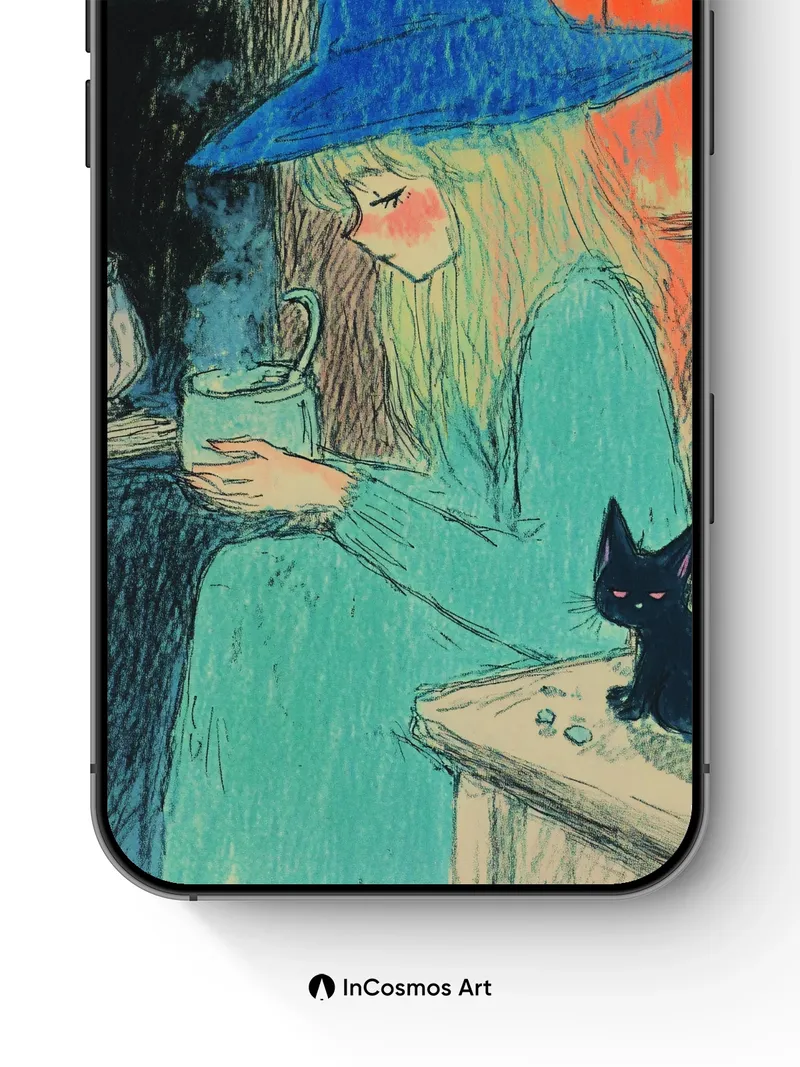 Did you know that in ancient folklore, witches brewed potions under the light of a waxing moon? Here, the blue-brimmed hat casts a soft shadow over her face as steam curls from the mug like breath in winter—her fingers wrapped around warmth, while the black cat watches with eyes like embered coals. The wall behind her bleeds rust and fire, yet she remains calm, untouched by time.